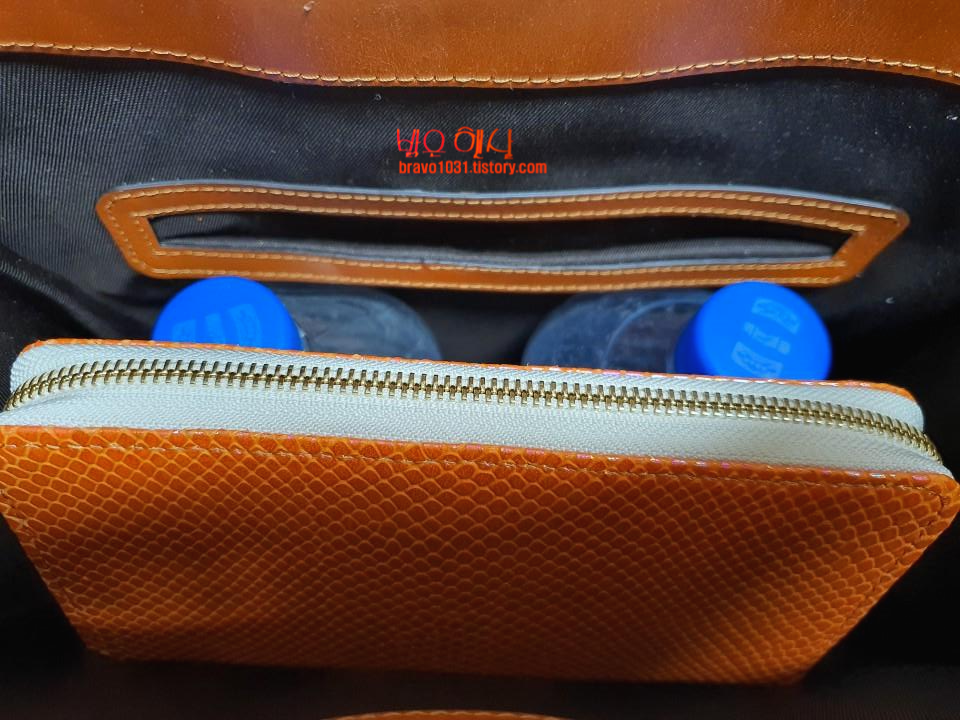 생수병 위로 사이즈가 큰 지퍼돌이 장지갑을 넣었음에도 위쪽 공간이 여유가 있다.