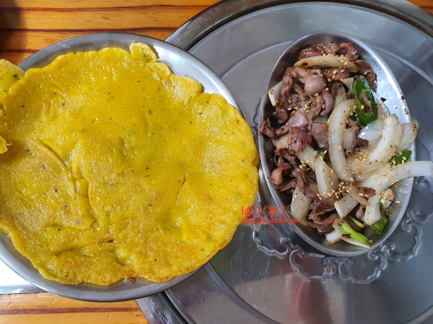 가장 눈길을 끄는 건 호박전과 닭똥집볶음이었다.