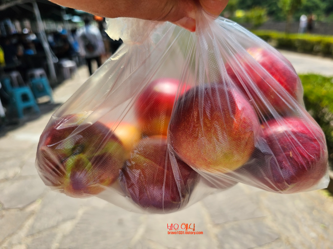 살구 천원에 기분이 좋아진 우리는 천도복숭아를 보는 순간 전날 호텔 식당에서 다른 여행팀 일원에게서 얻어 먹은 천도복숭아가 생각나서 천원어치 하나를 더 샀다.
