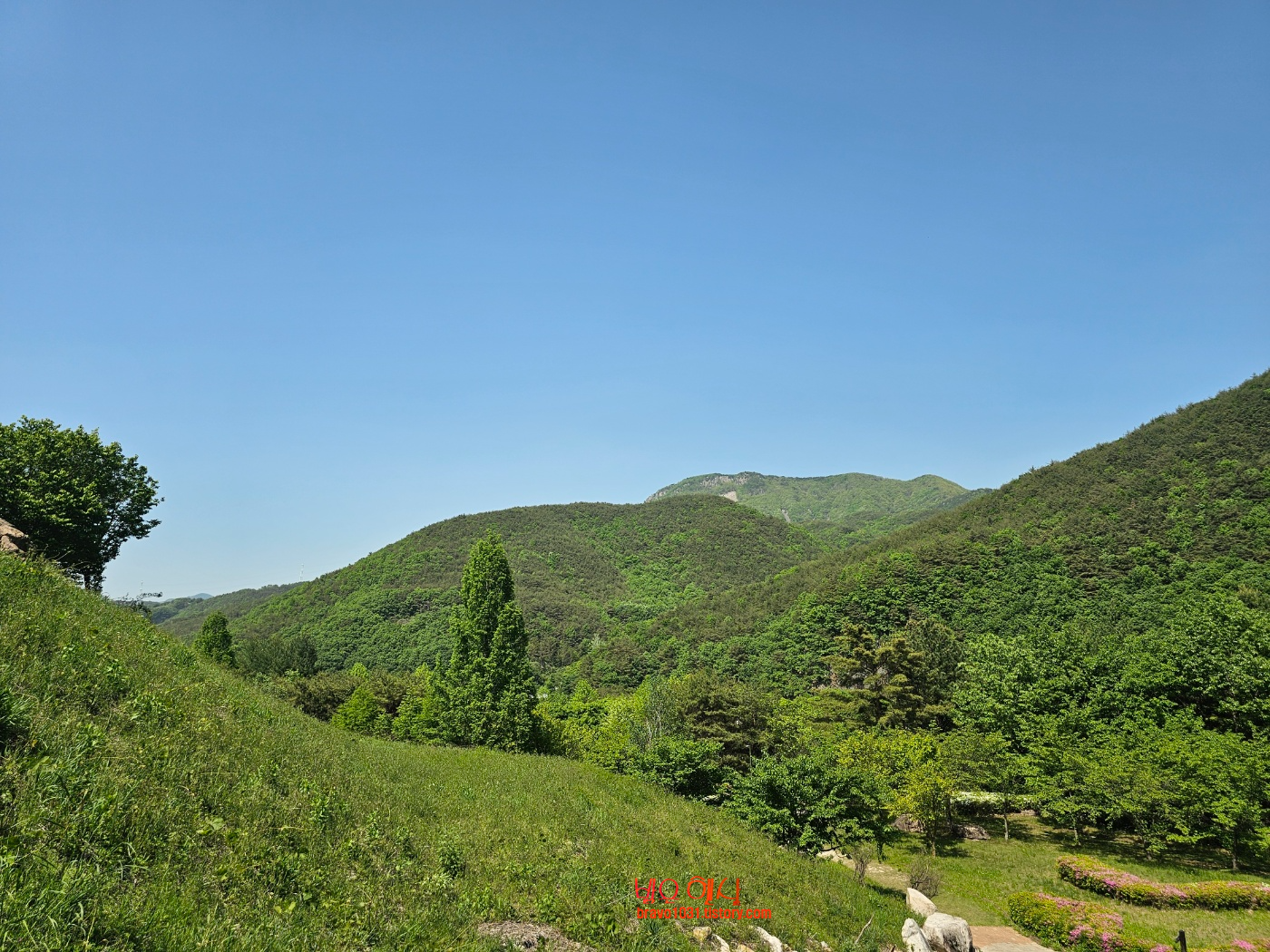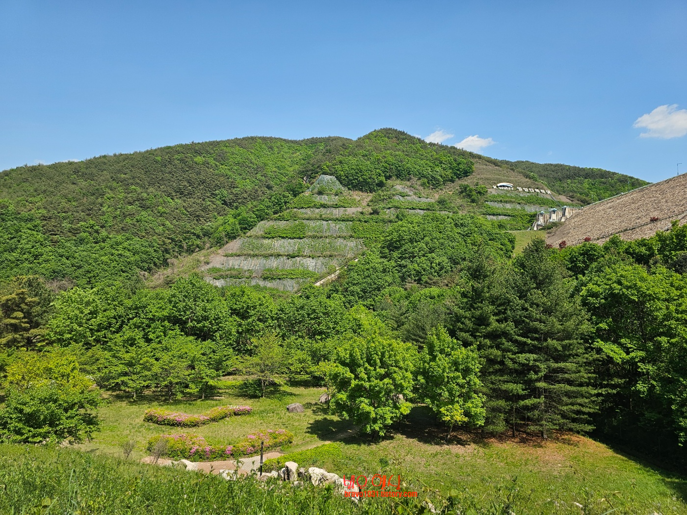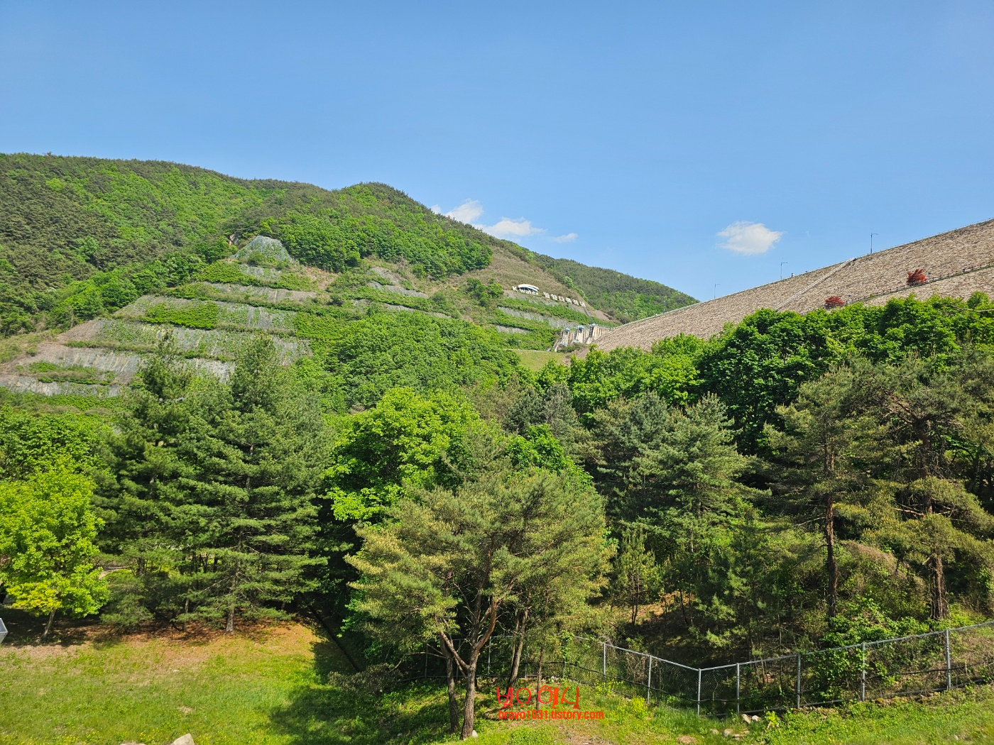 하늘은 맑았고 낮은 산과 댐과 나무들이 잘 어우러지고 있는 모습이었다.