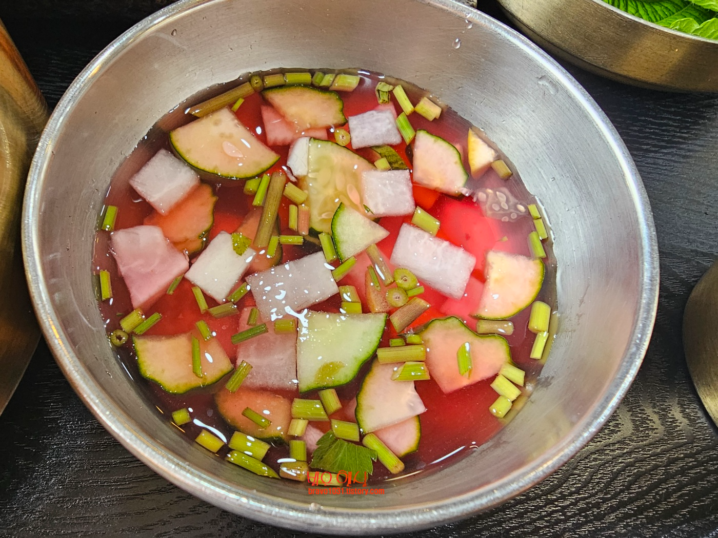 미나리의 향긋함이 잘 어울리는 물김치여서 시원하게 먹을 수 있었다.