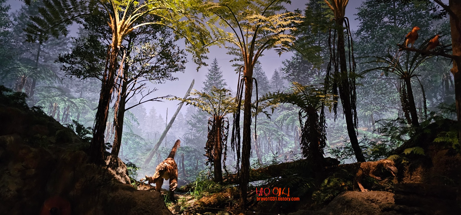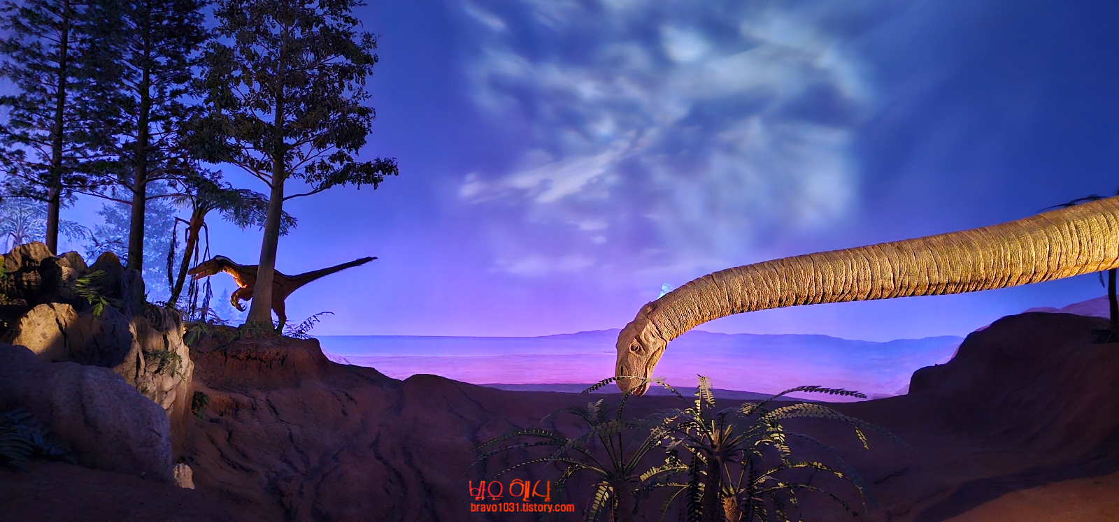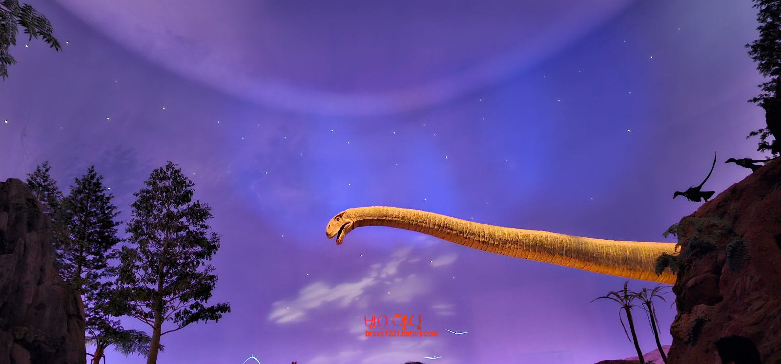 공간은 둥글게 되어 있고 천장은 높고 둥글어서 앞의 목이 긴 공룡(이름을 알듯 말듯)의 움직임과 뒤의 화산과 하늘의 변화를 봤다가 뒤 돌아서 밀림 속에 있는 공룡들을 보기도 했다.