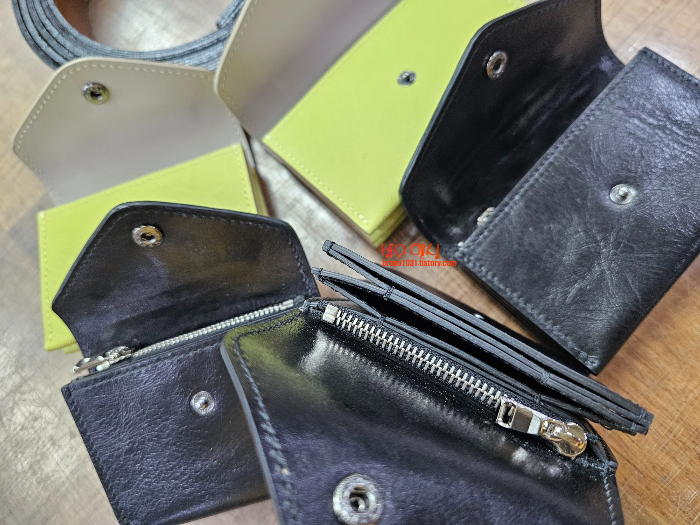 검정 지갑은 검정 엣지를 올렷고 연두색 지갑은 안감과 맞춰서 회색의 엣지를 올렸다.