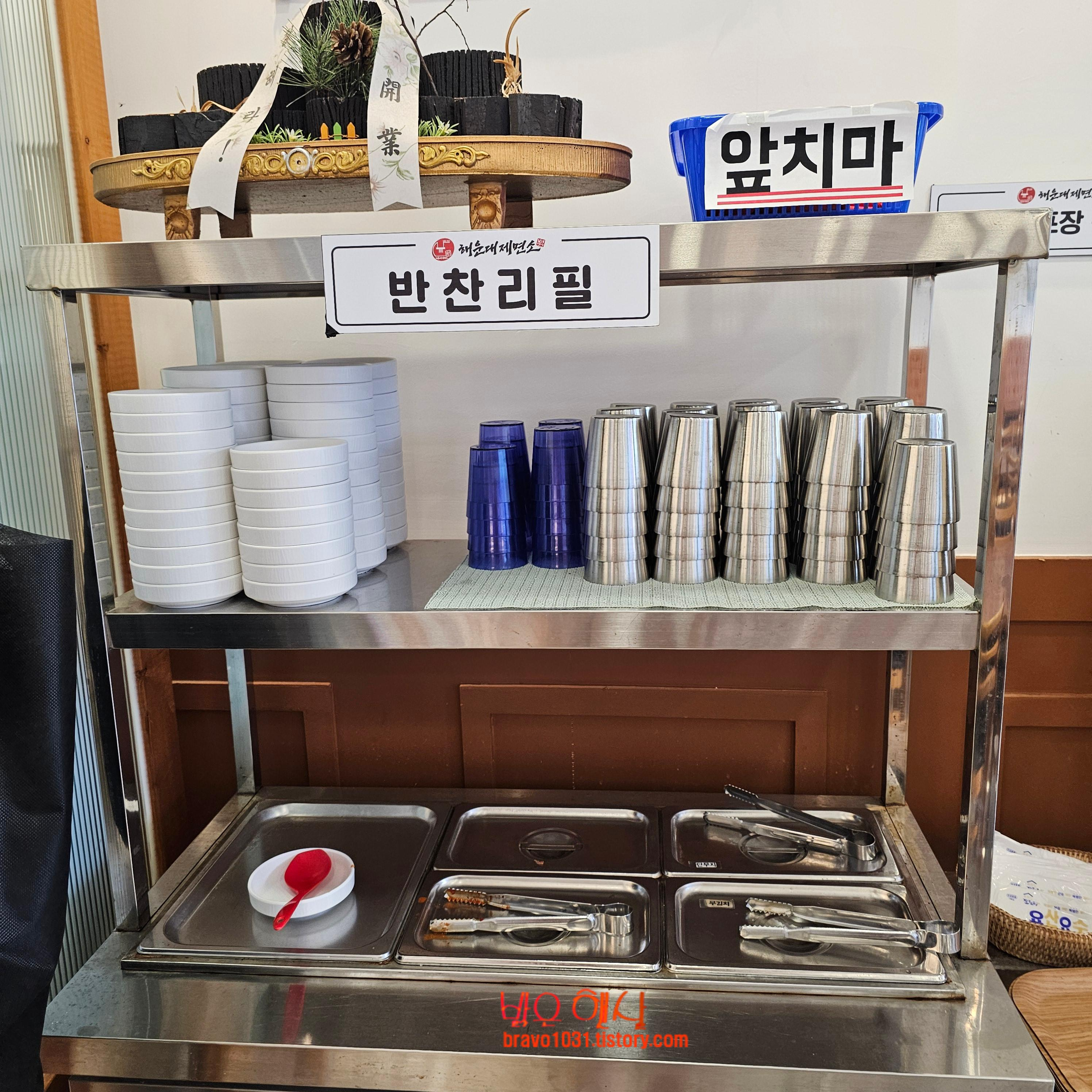 식당의 한 쪽에는 온육수와 반찬 셀프바가 있다.