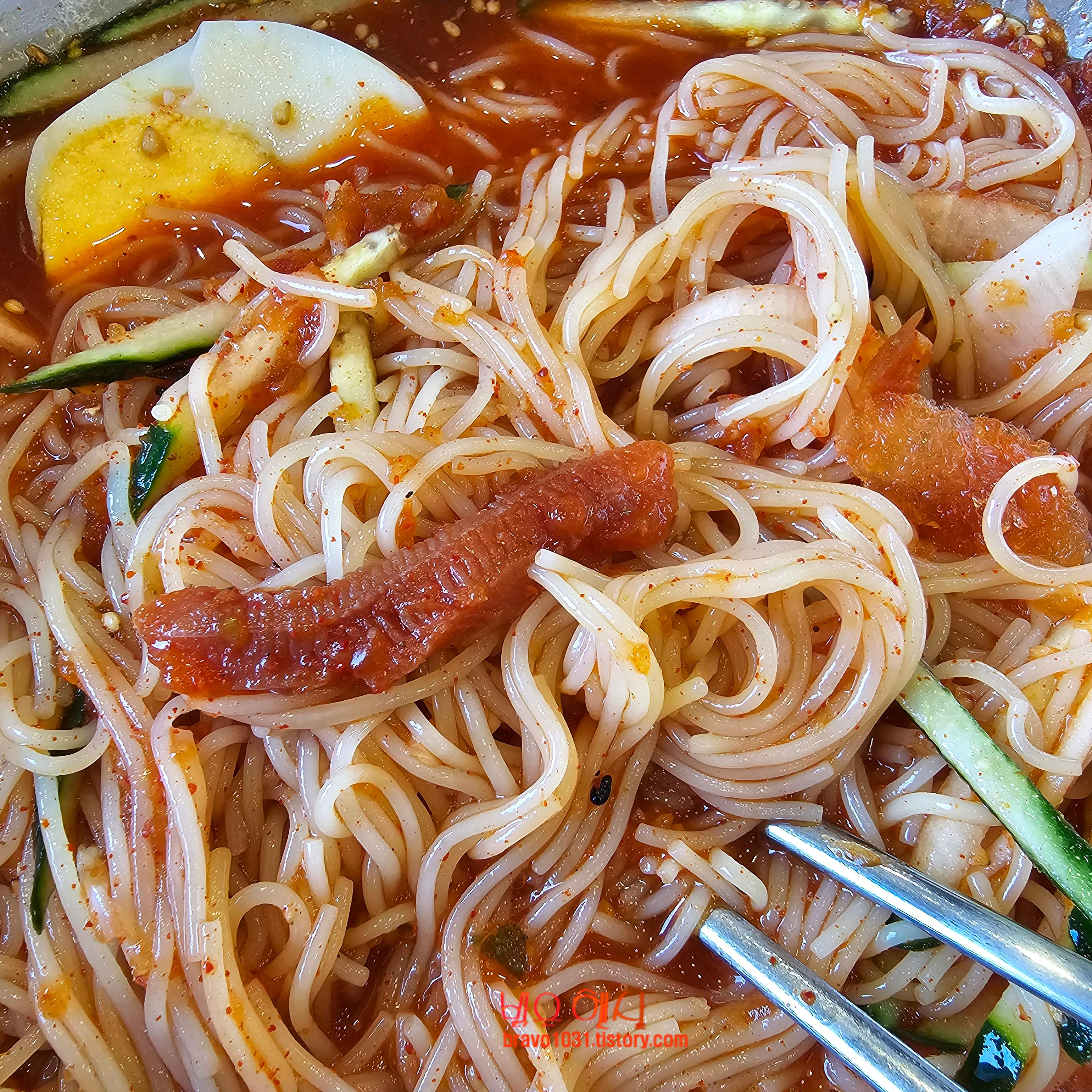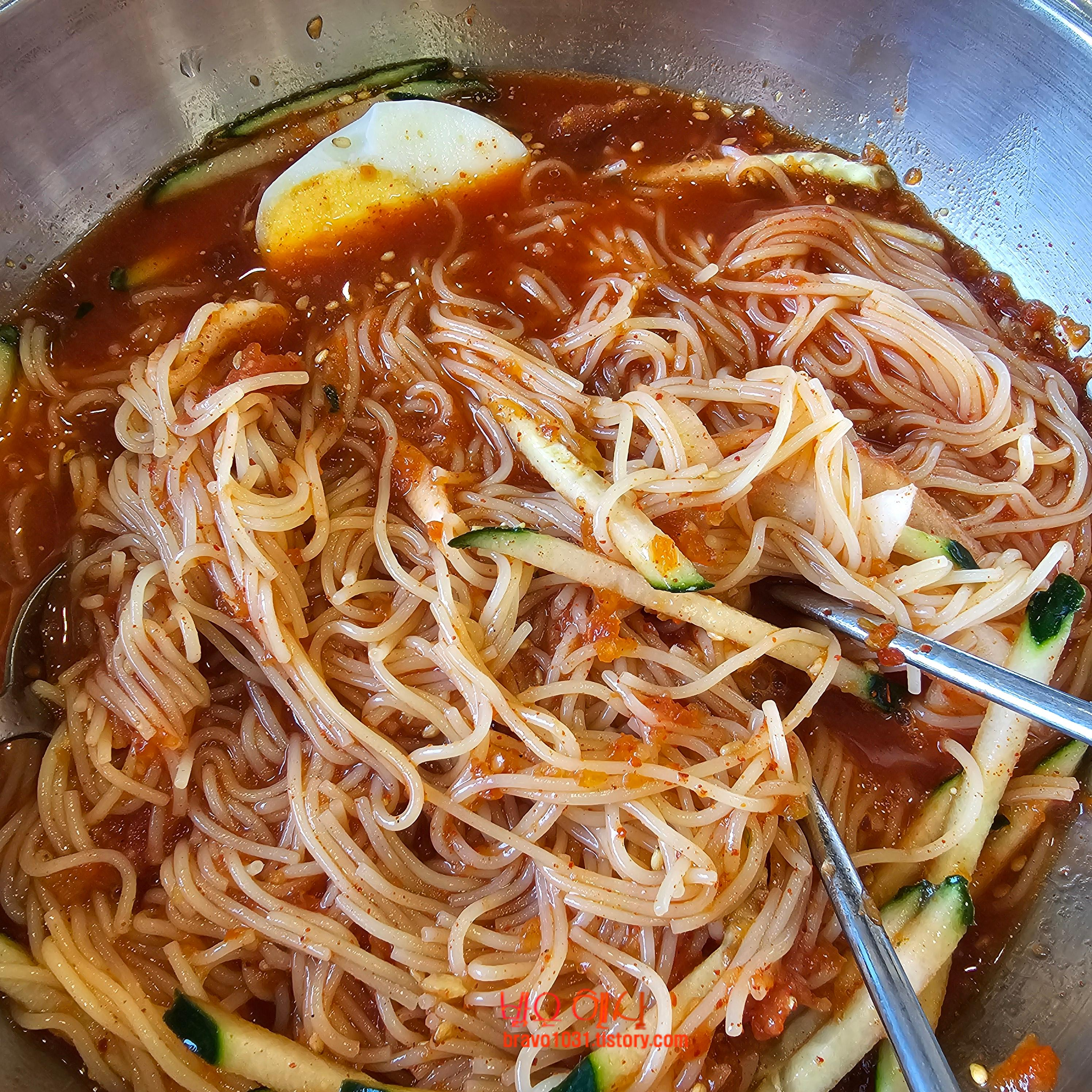 물비빔면은 이렇게 섞어 주면 비빔면도 아니고 물밀면도 아닌 어중간한 상태가 되는데 국물이 걸죽하게 있으면서 면에 양념도 반쯤 어우러지는 그런 면이 된다.