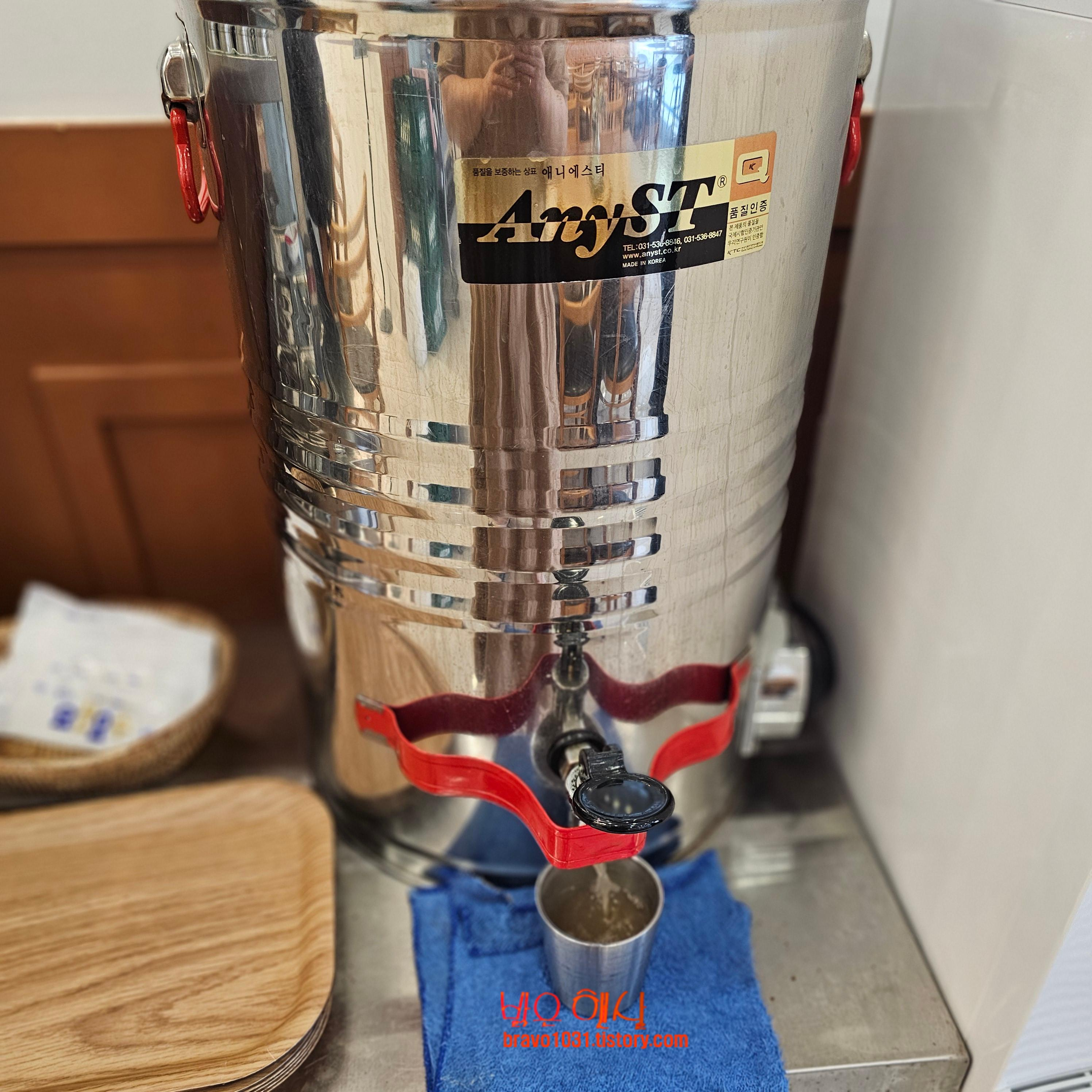 온육수는 스테인레스 컵에 받으면 되는데 이중 컵이라 손이 뜨겁지는 않다.