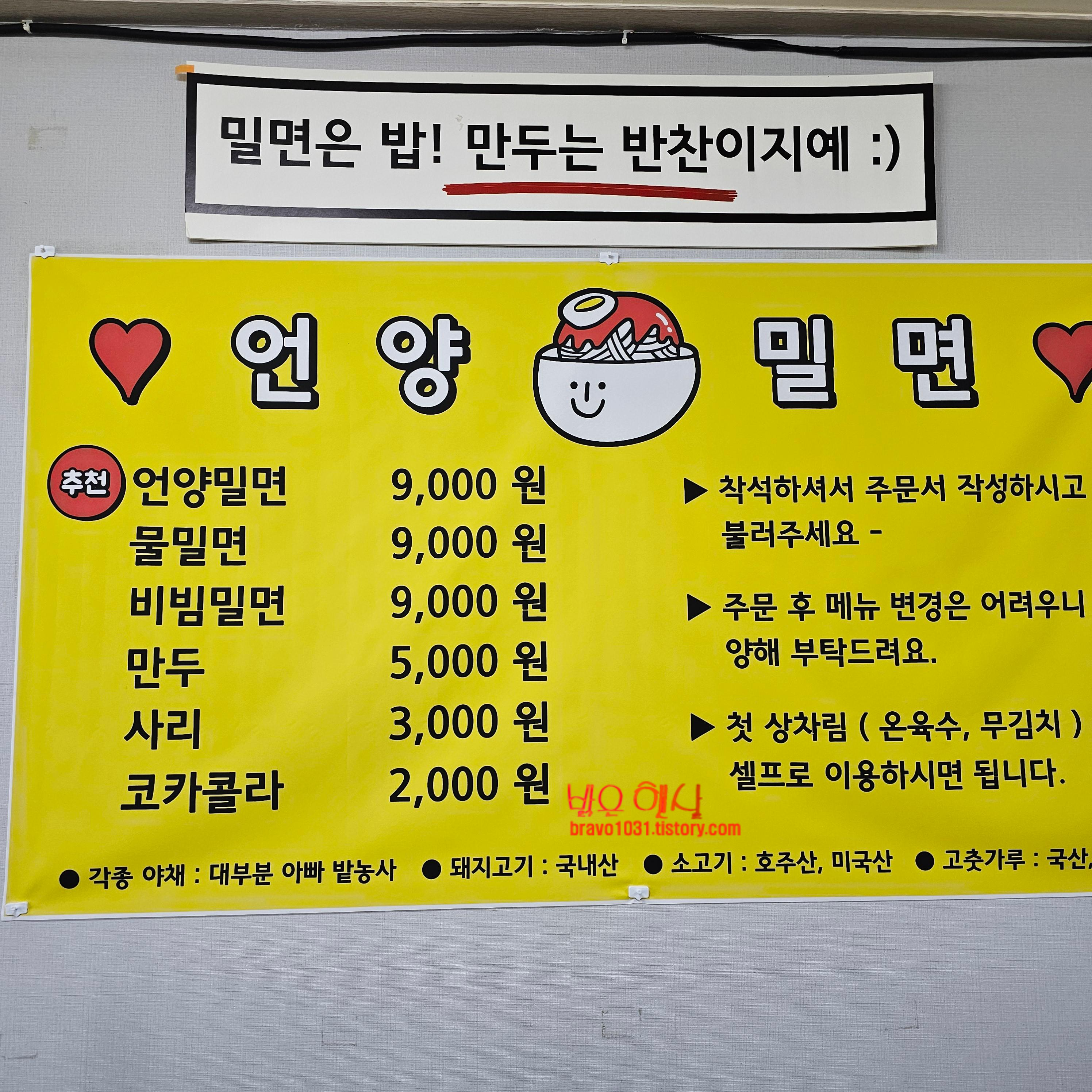 언양밀면 9,000원 물밀면 9,000원 비빔밀면 9,000원 만두 5,000원 사리 3,000원