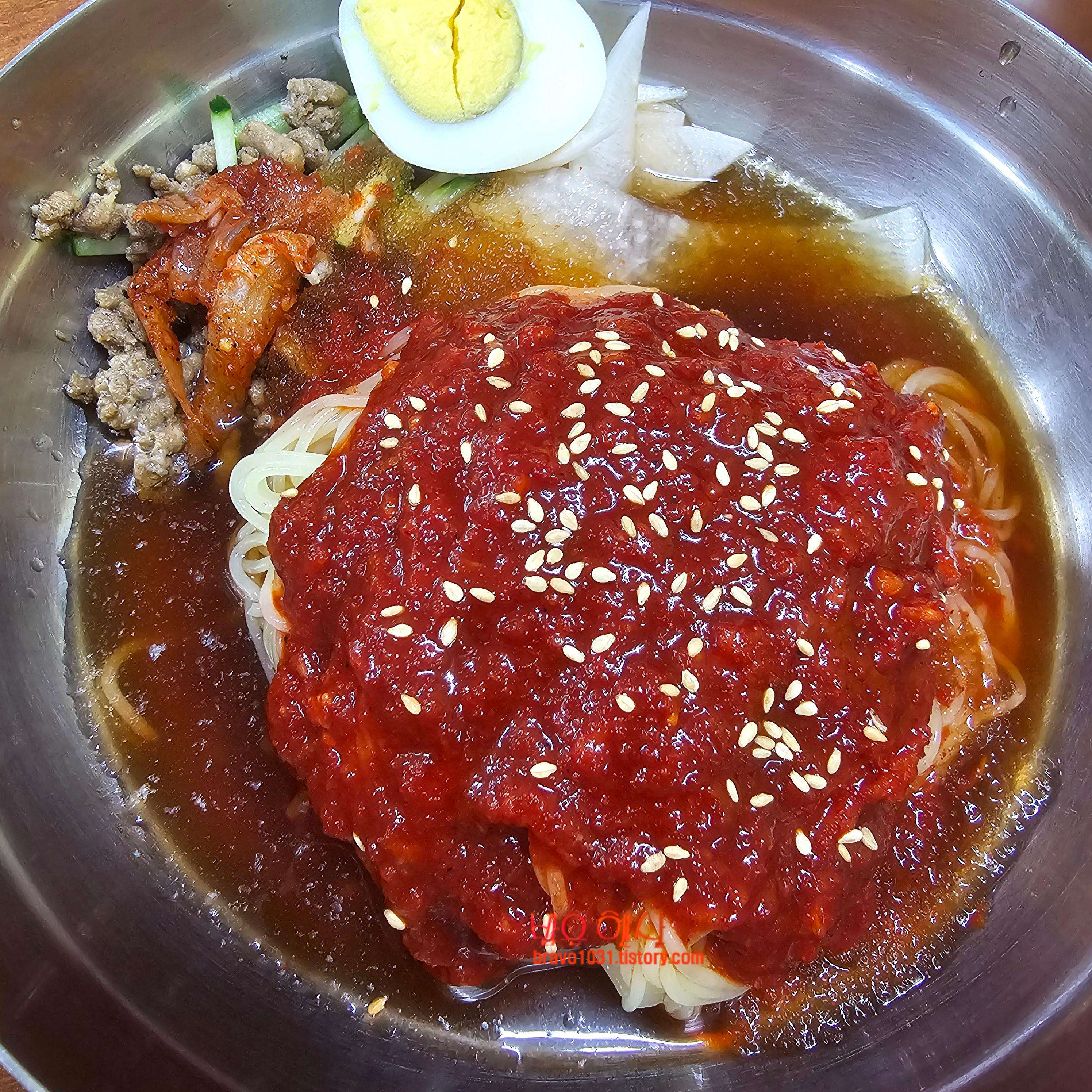 색이 짙은 육수가 절반쯤 담겨 있고 면 위에는 비빔양념장이 가득 올라가 있다.