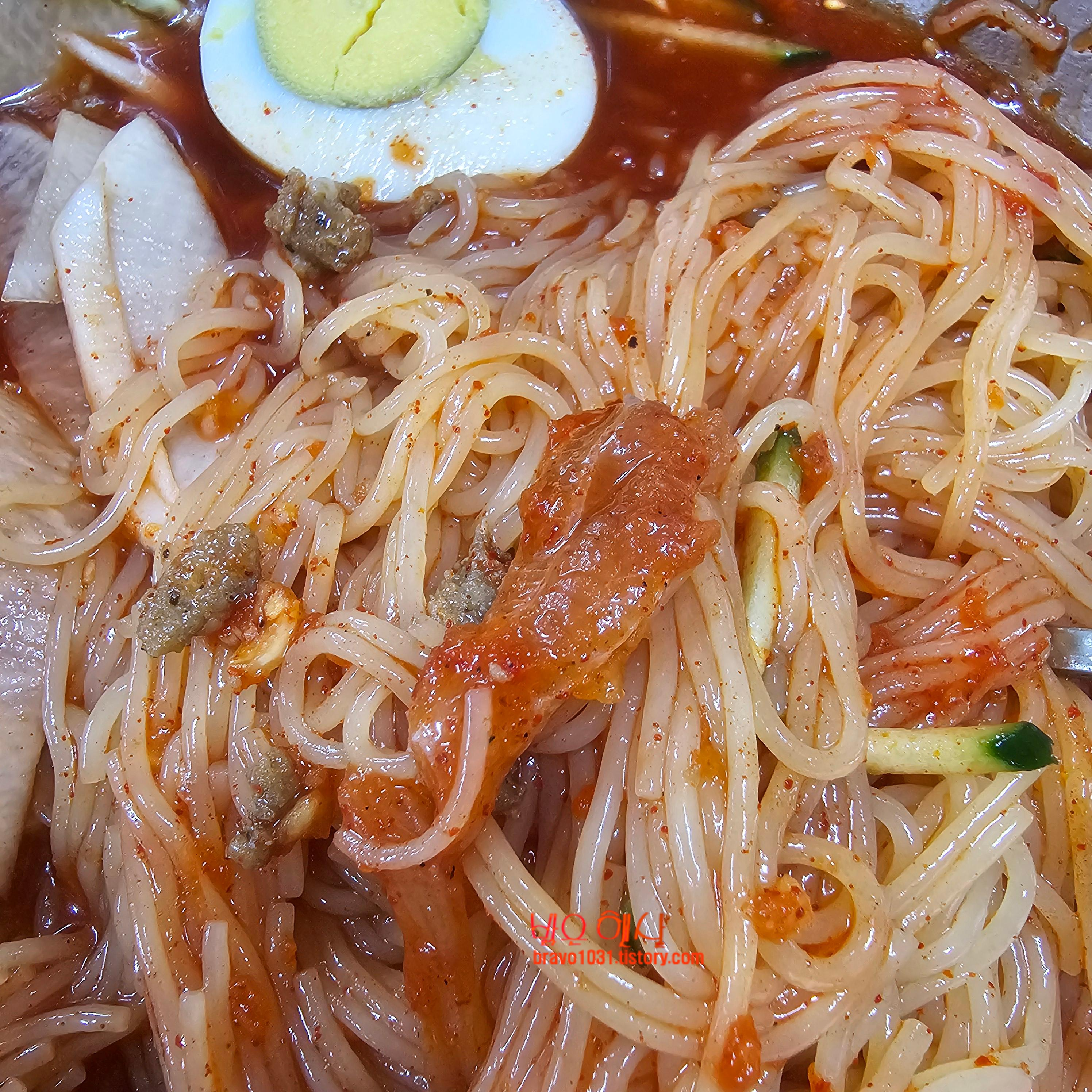볶은다진고기, 오이채, 삶은계란, 무절임, 회무침이 고명인데 푸짐하다기 보다는 살짝 부실한 듯한 고명이었다.