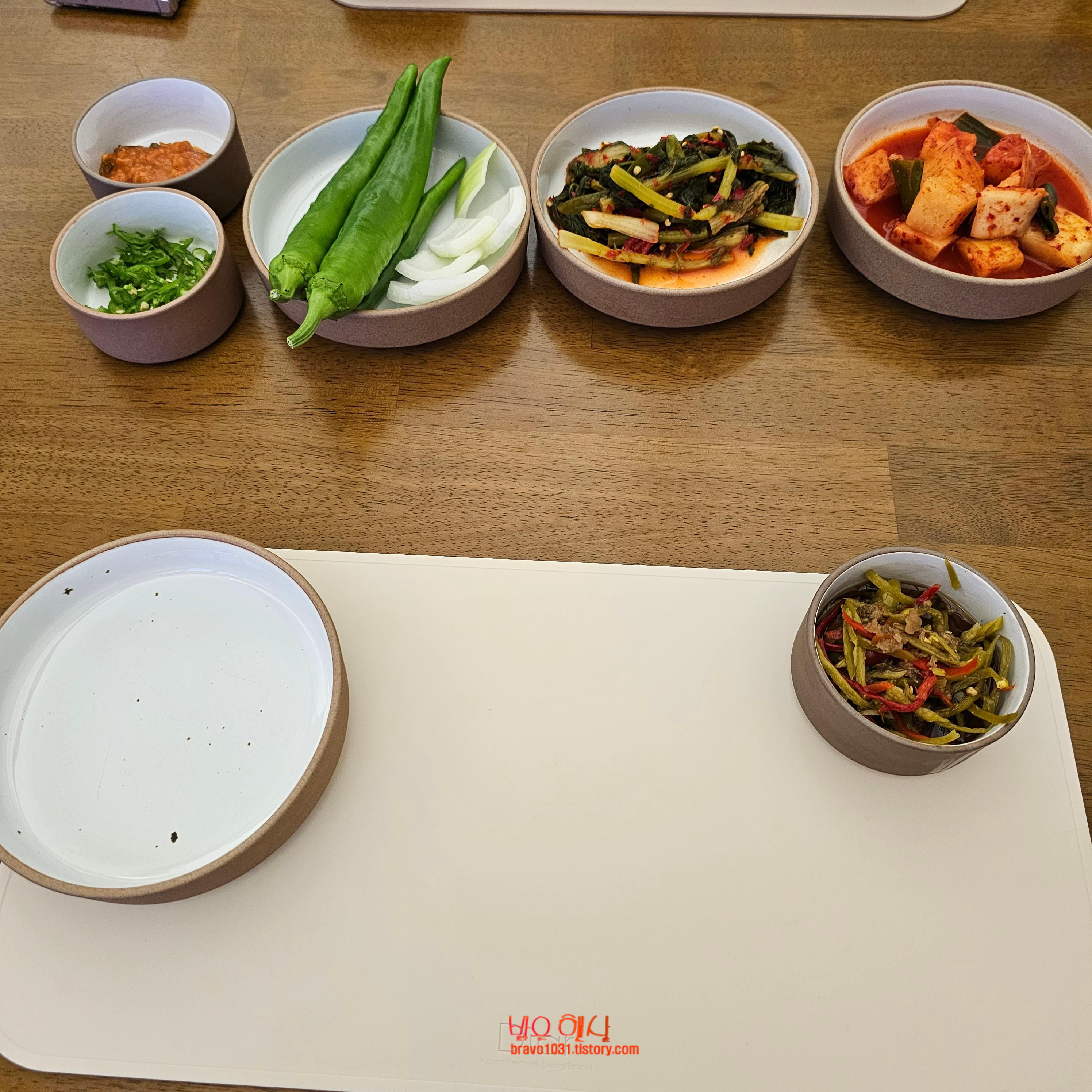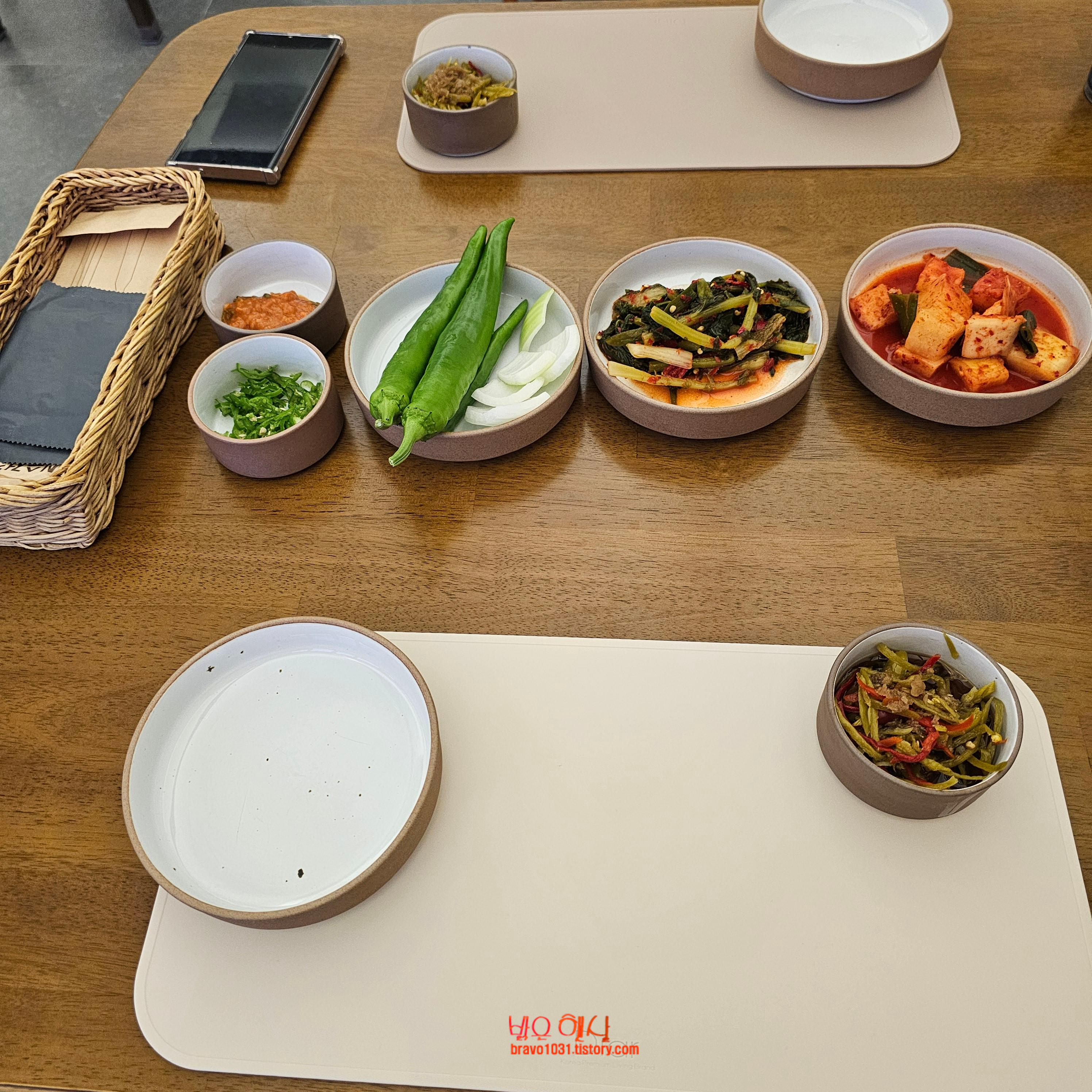 테이블 매트가 앞에 깔리고 깍두기, 열무김치, 양파와 고추, 쌈장, 고추다짐이 나왔다.