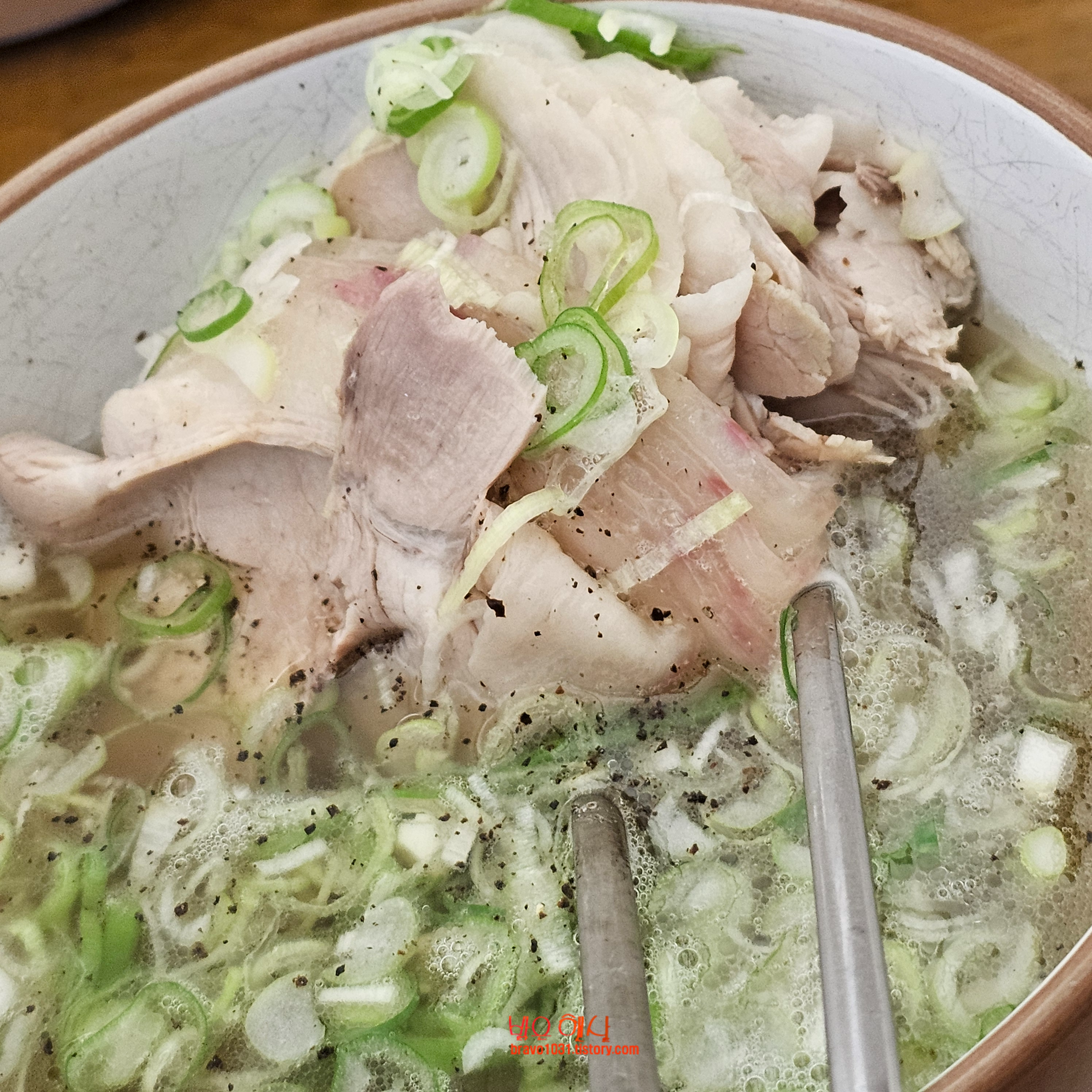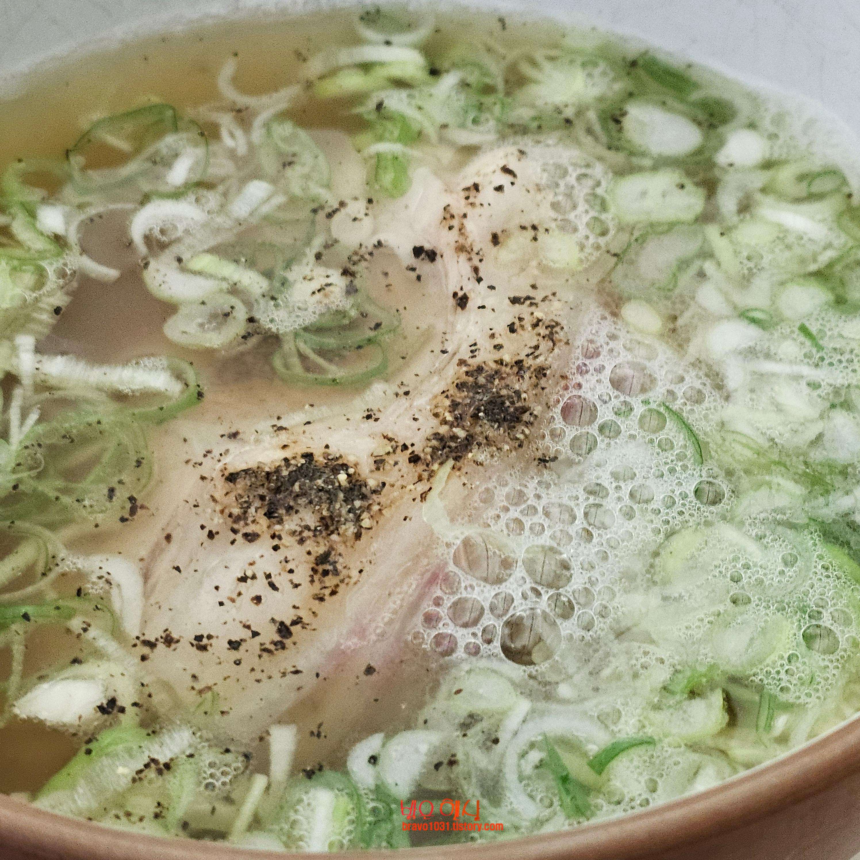 나온 돼지 곰탕에는 대파가 많이 올라가 있었고 후추가 조금 뿌려져 있었다.
