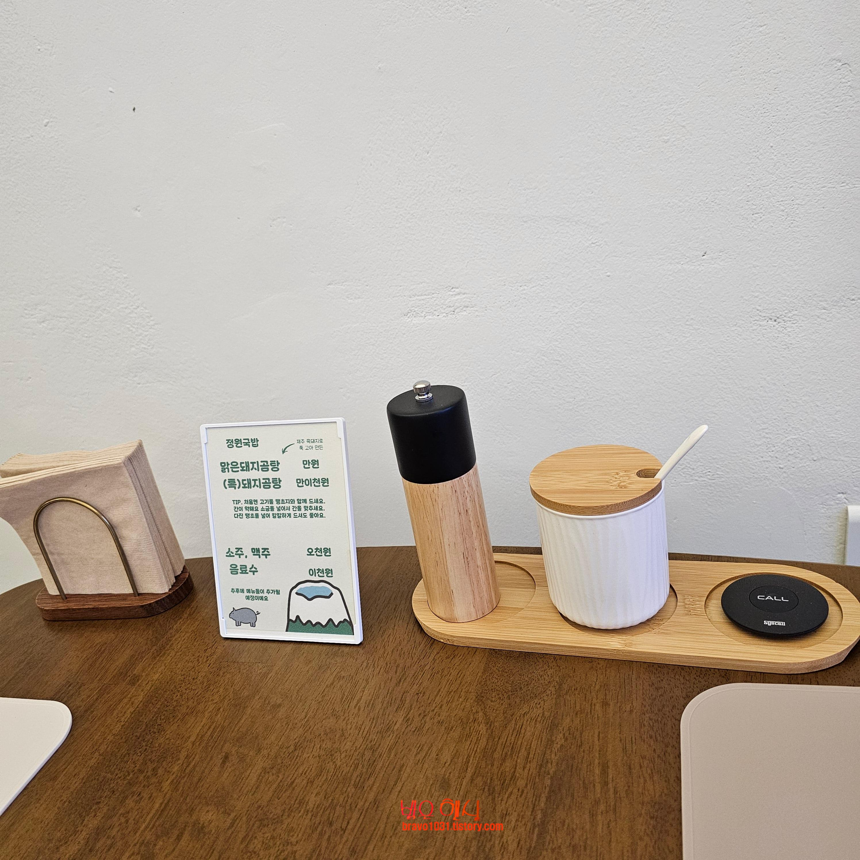 후추 그라인더, 소금통도 테이블과 분위기를 비슷하게 맞췄고 옆에 호출벨도 있었다.