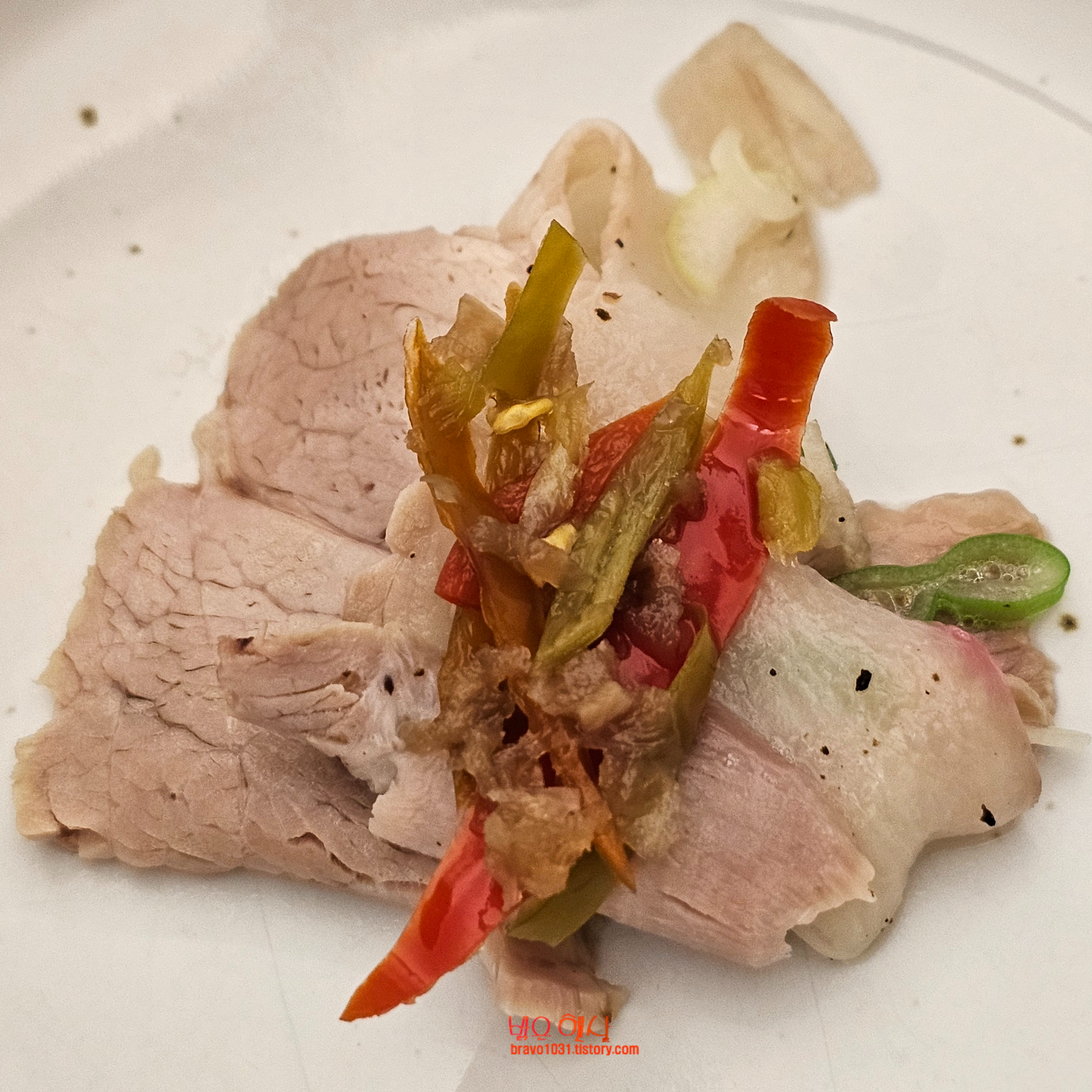 냉동 상태에서 기계로 곱게 슬라이스를 한 다음 그 덩어리를 풀지 않고 그대로 국물에 넣어서 끓여 익혔나 싶은 의심이 들 정도로 얇았다.