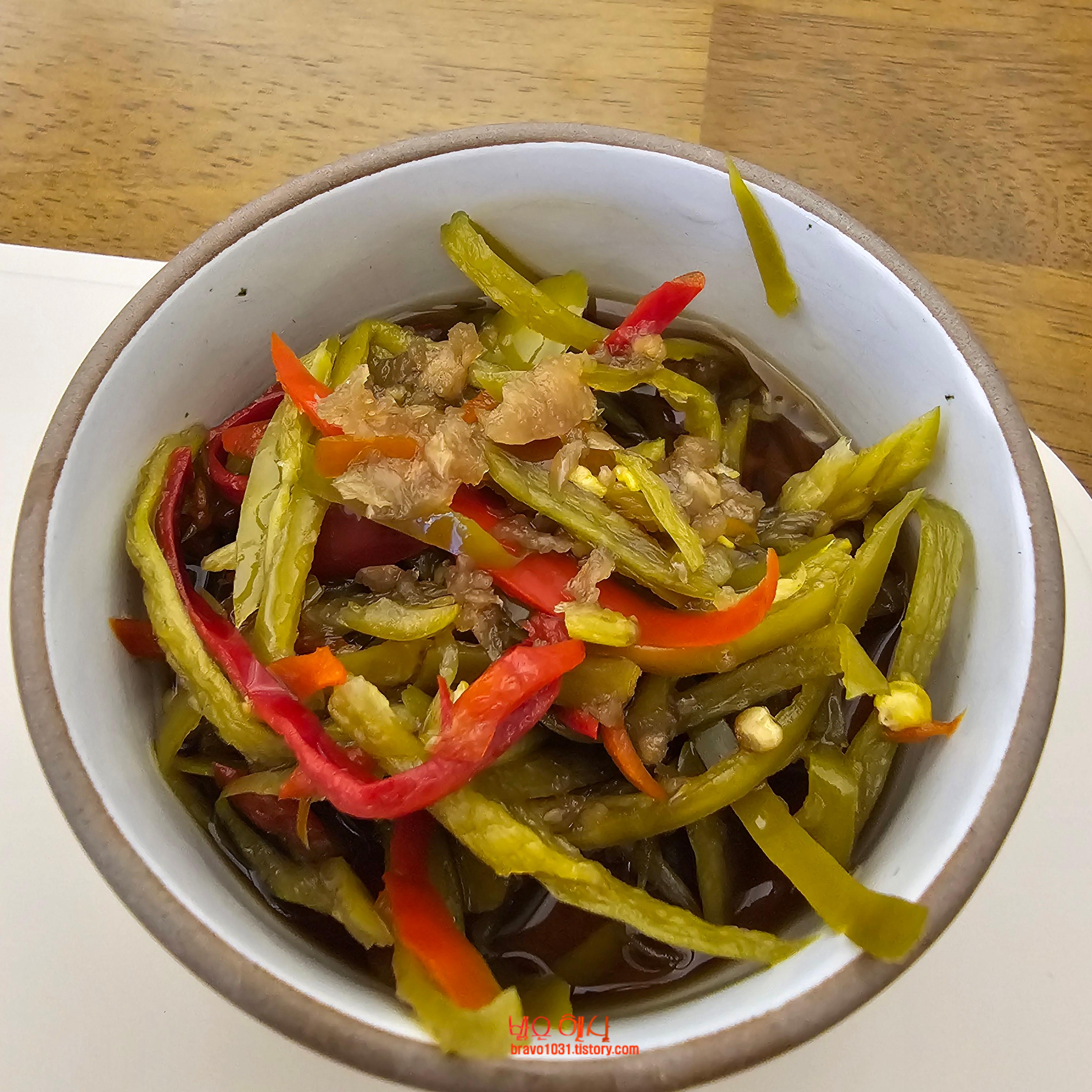 작지 않은 종지에 가득 담겨서 나오는데 청량초를 길게 채 썰어 지로 담은 듯 했다.