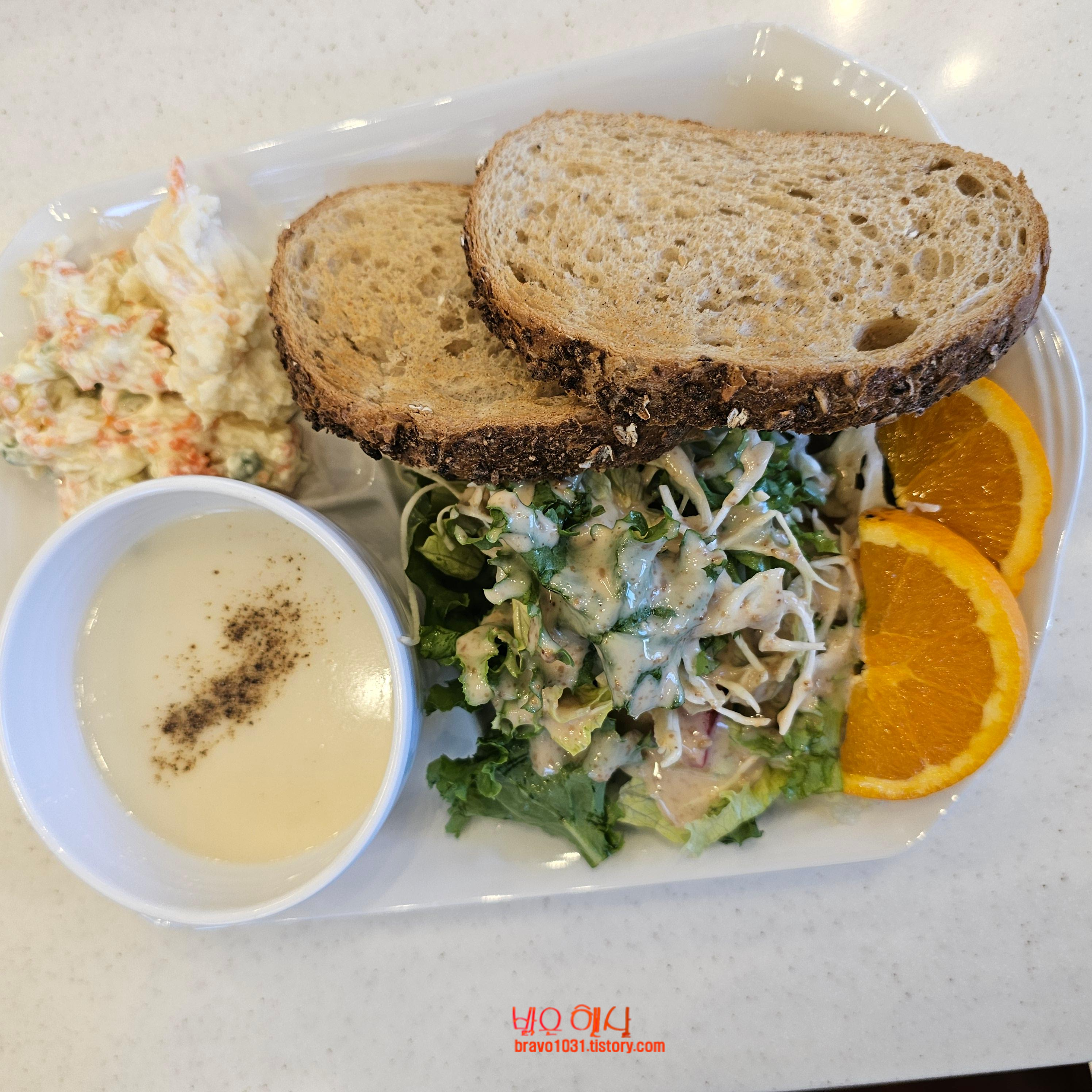 난 땡기지 않은 한식이라 크림스프, 샐러드, 야채 샐러드, 오렌지, 빵 두조각을 가지고 와서 먹었다.