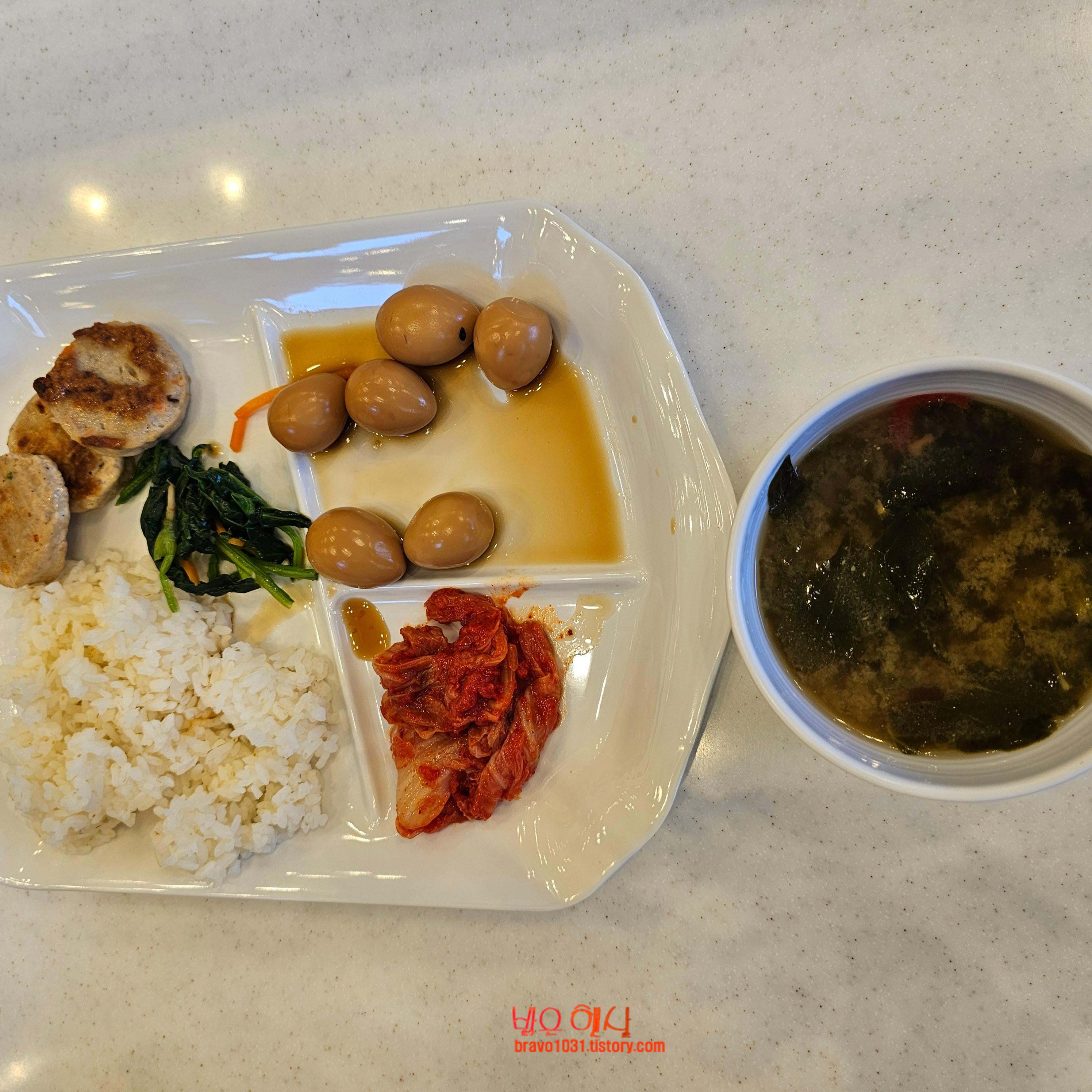 쌀밥, 배추김치, 동그랑땡, 나물(참나물 또는 시금치나물), 메추리알장조림, 시락국이었다.