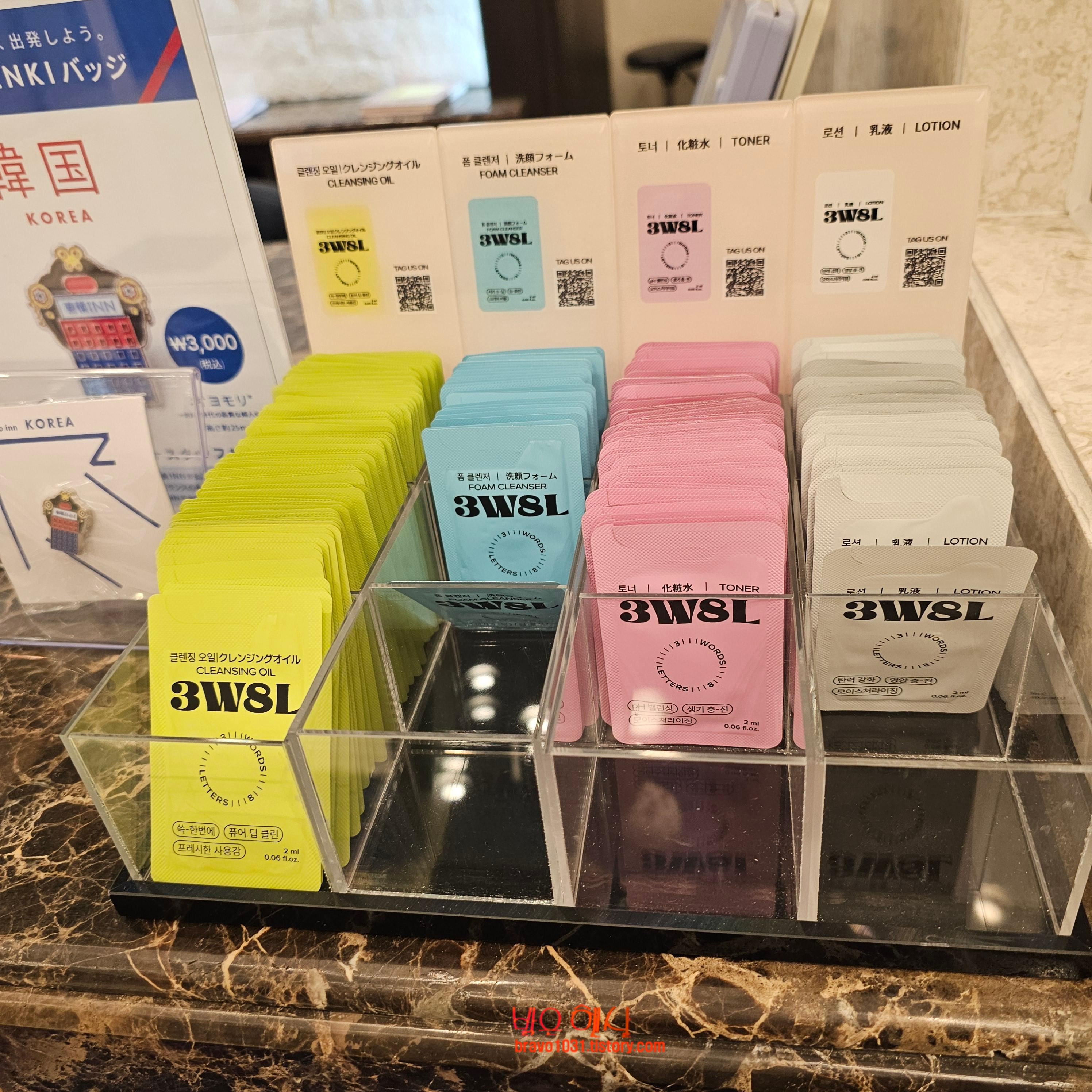 리셉션 한쪽 구석에는 기본 어메니티로 일회용 스킨케어 제품이 있었다.