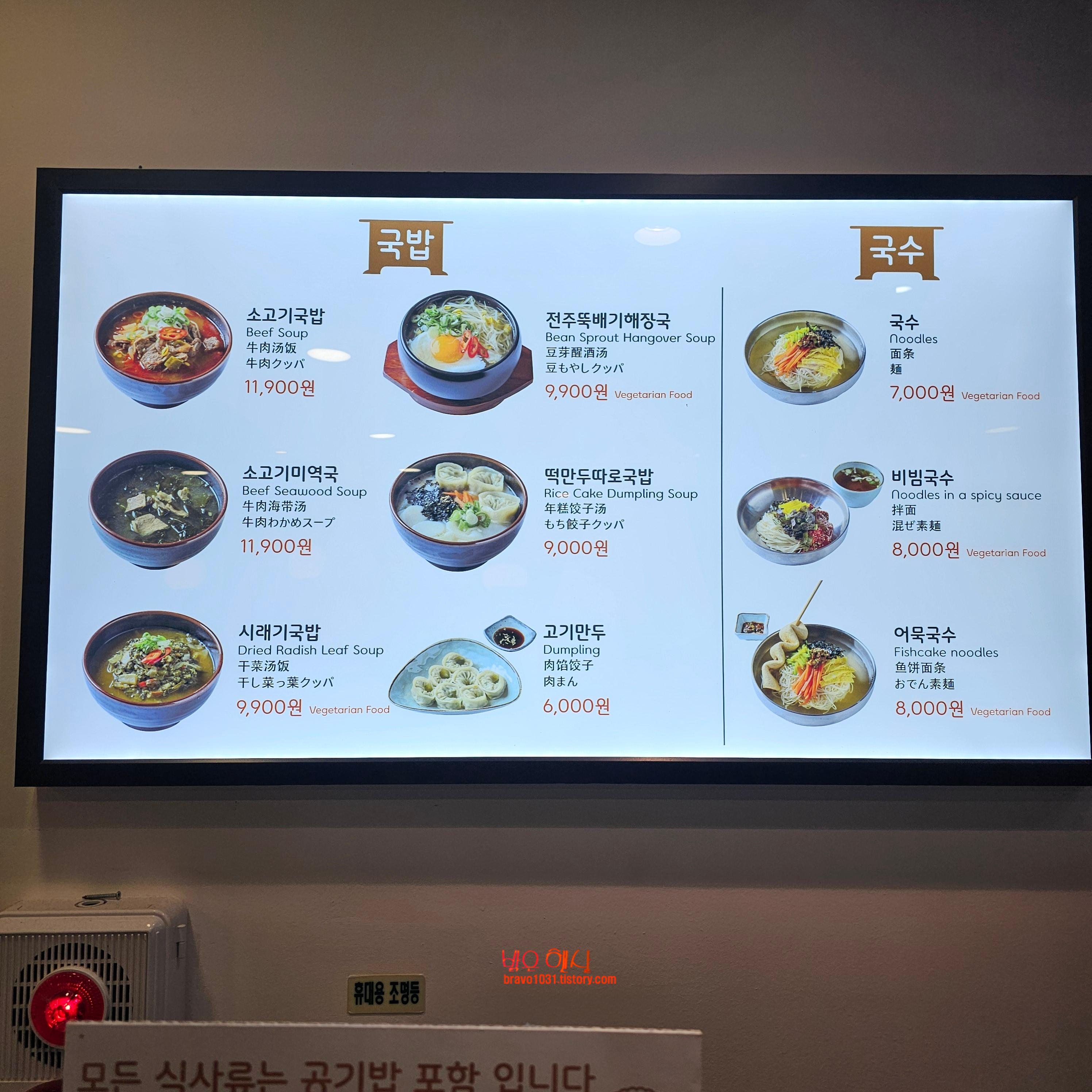소고기국밥 11,900원 진주뚝배기해장국 9,900원 소고기미역국 11,900원 떡만두따로국밥 9,000원 시래기국밥 9,900원