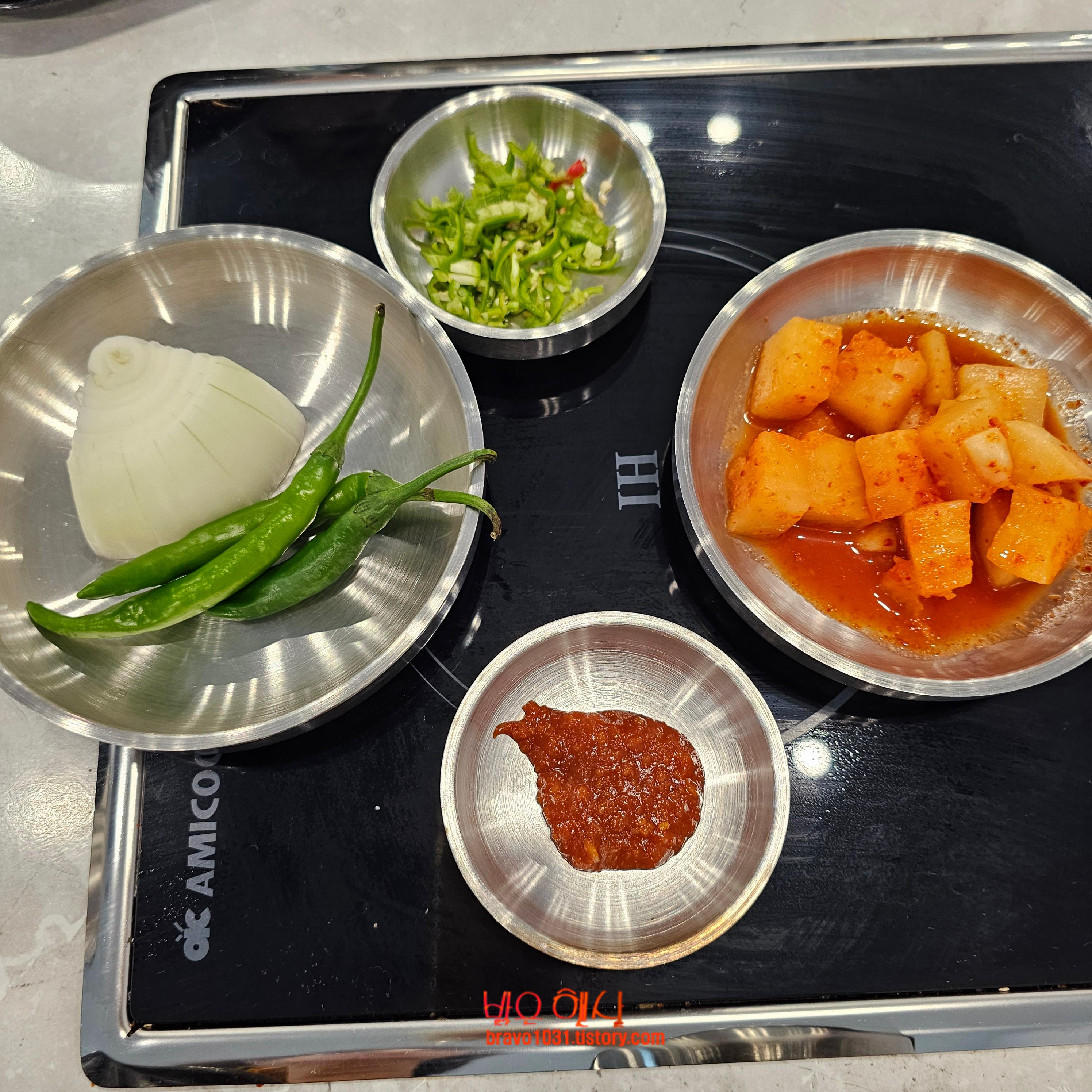 기본찬은 깍두기, 풋고추 및 청량고추, 생양파, 다진 청량, 쌈장 정도 나온다.