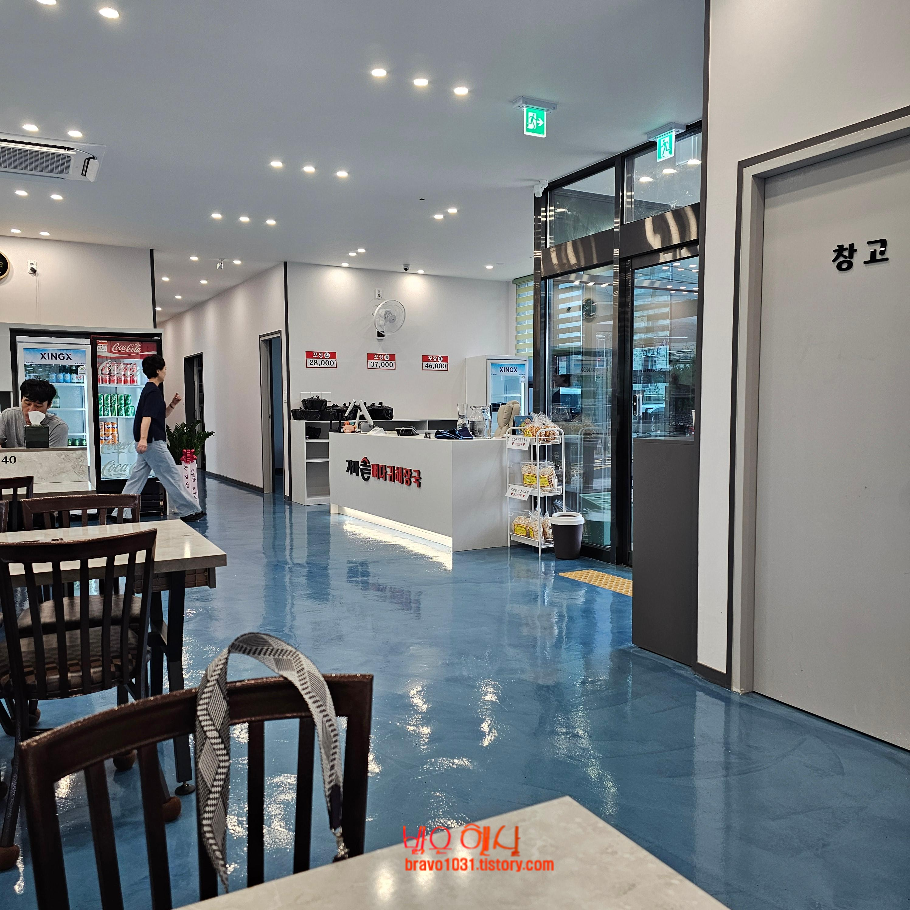 바닥은 조금 아니 많이 애매한 푸른색 타일이었지만 벽과 천장이 흰색이라 바닥만 흐린눈으로 보면 나쁘지 않은 식당 내부라는 생각이 들었다.