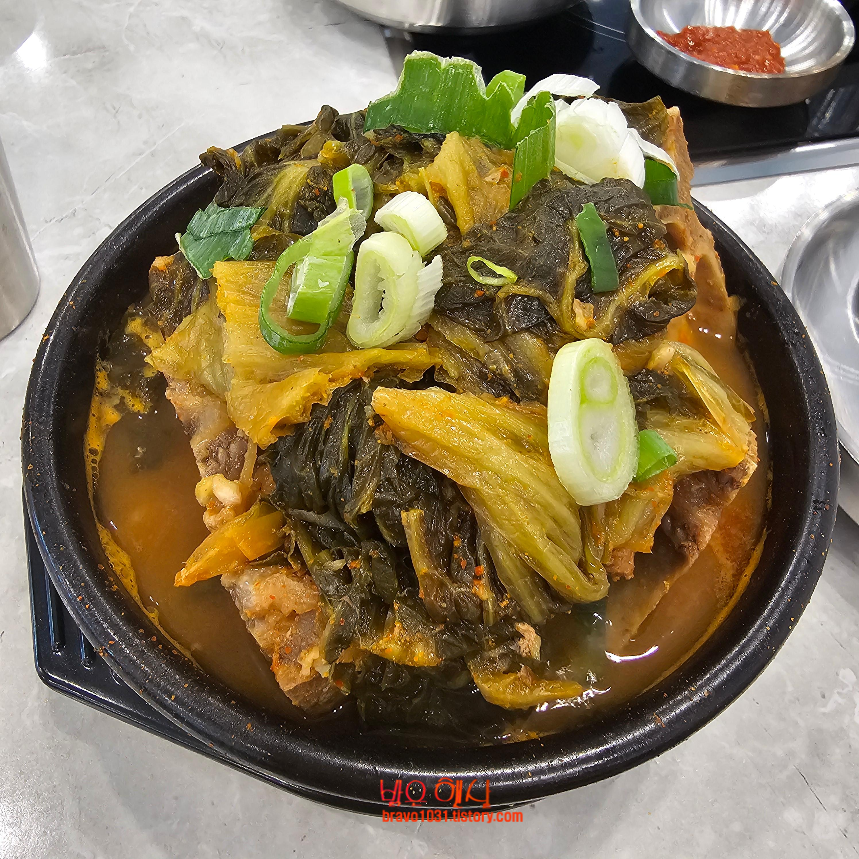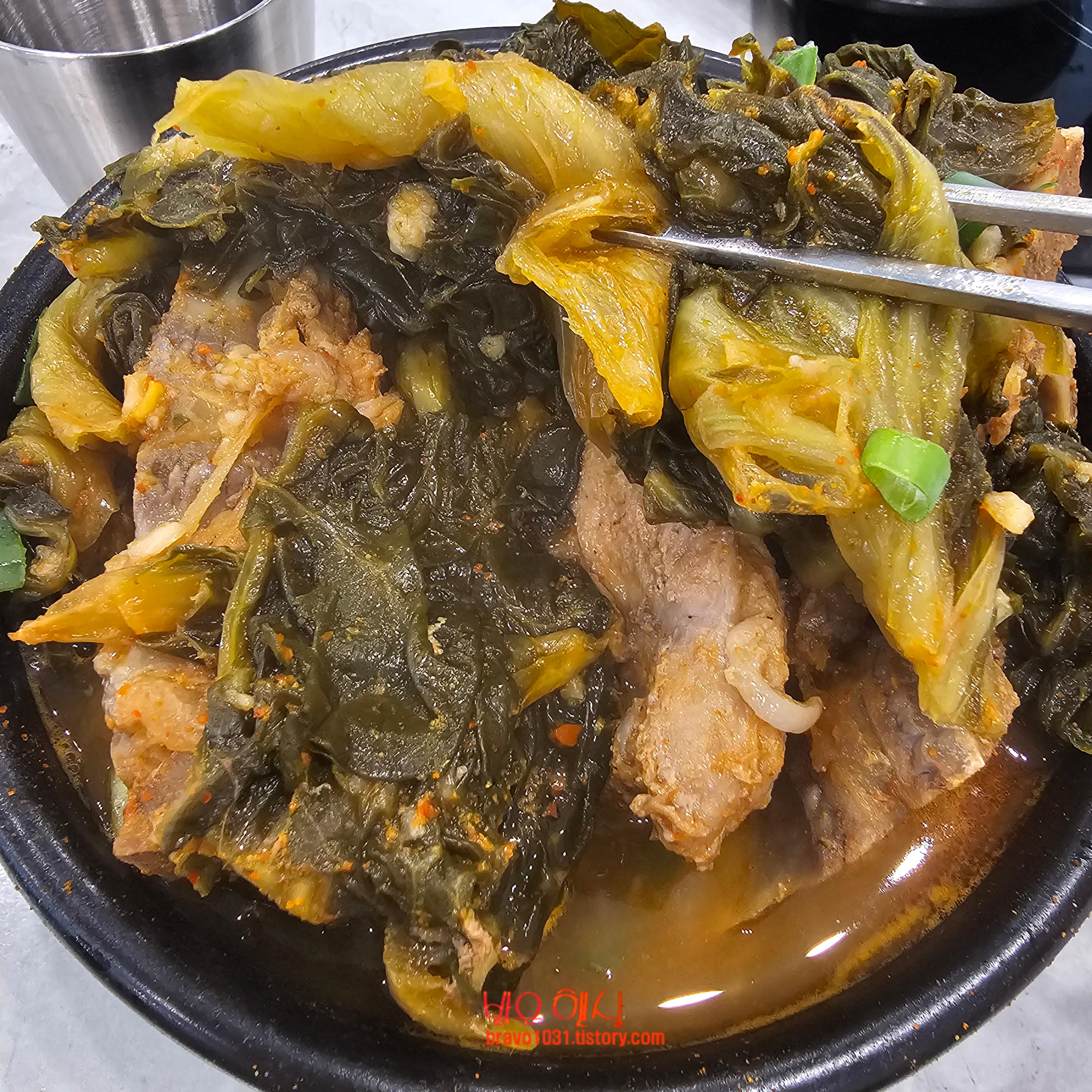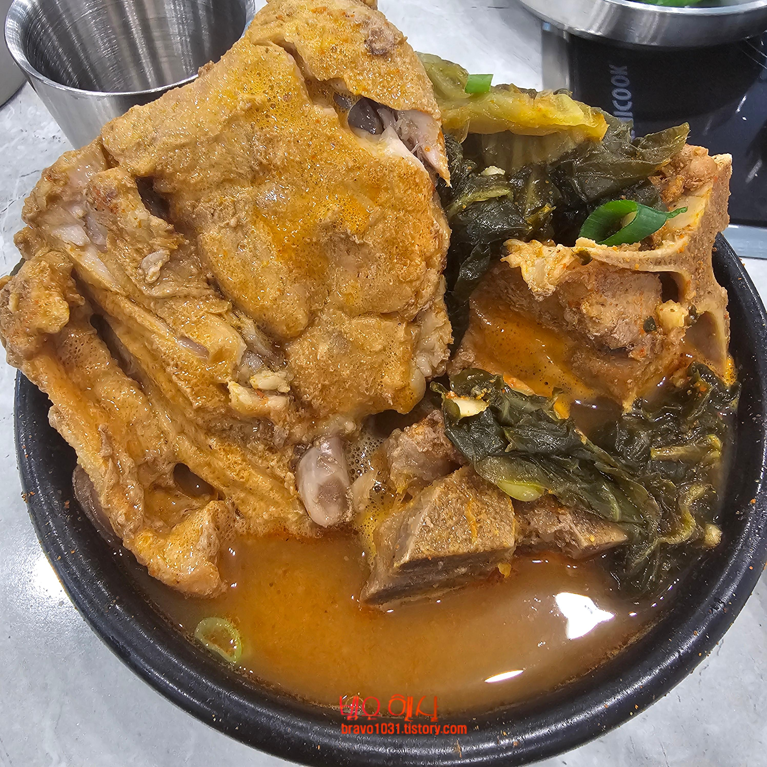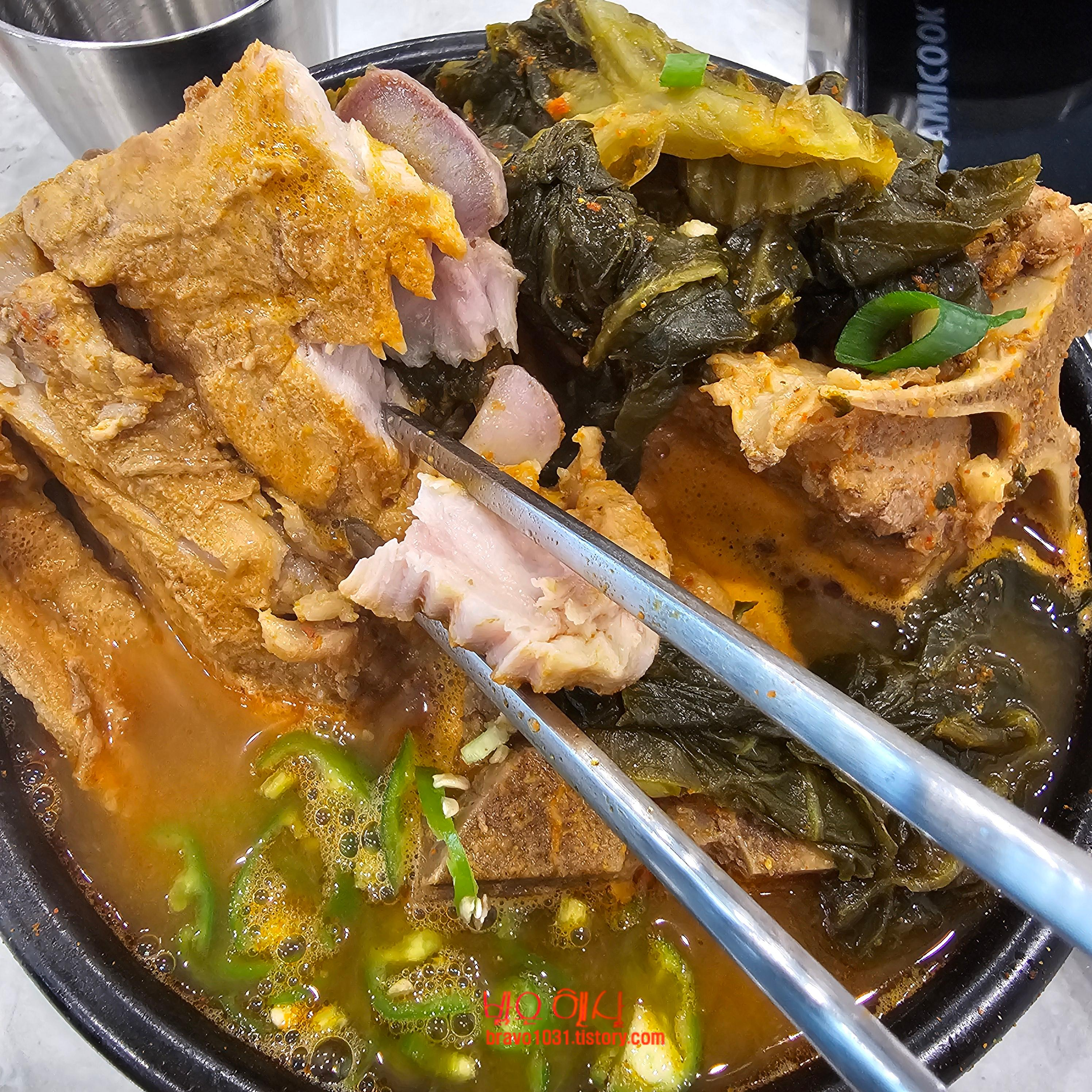위에 올려 진 시래기를 살짝 걷어 보면 뚝배기 안에 등뼈가 들어 있는 것이 보인다.