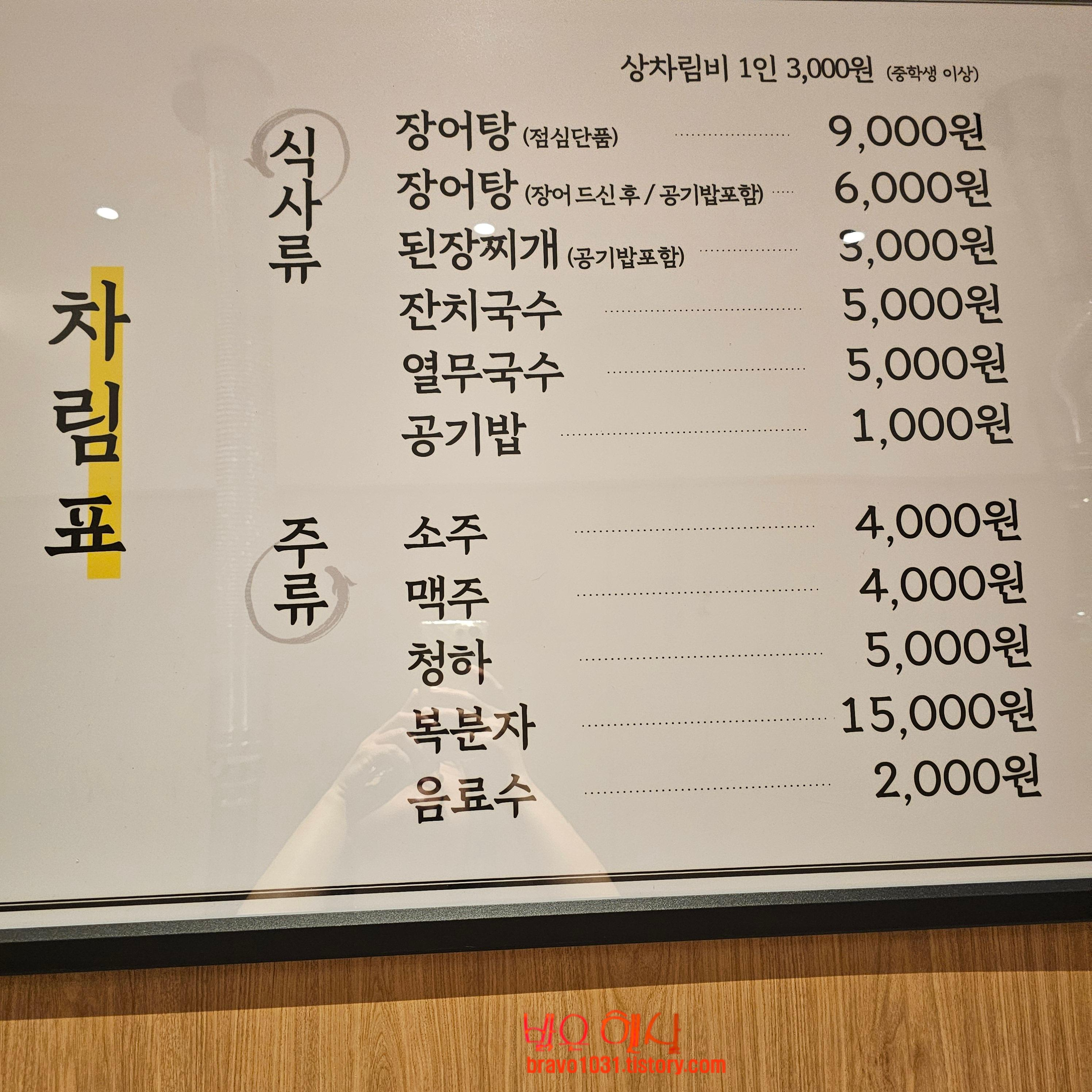 그러니 메뉴판에는 장어 가격에 대한 내용은 없고 상차림비, 장어탕 등 식사나 주류, 음료수 메뉴만 있었다.