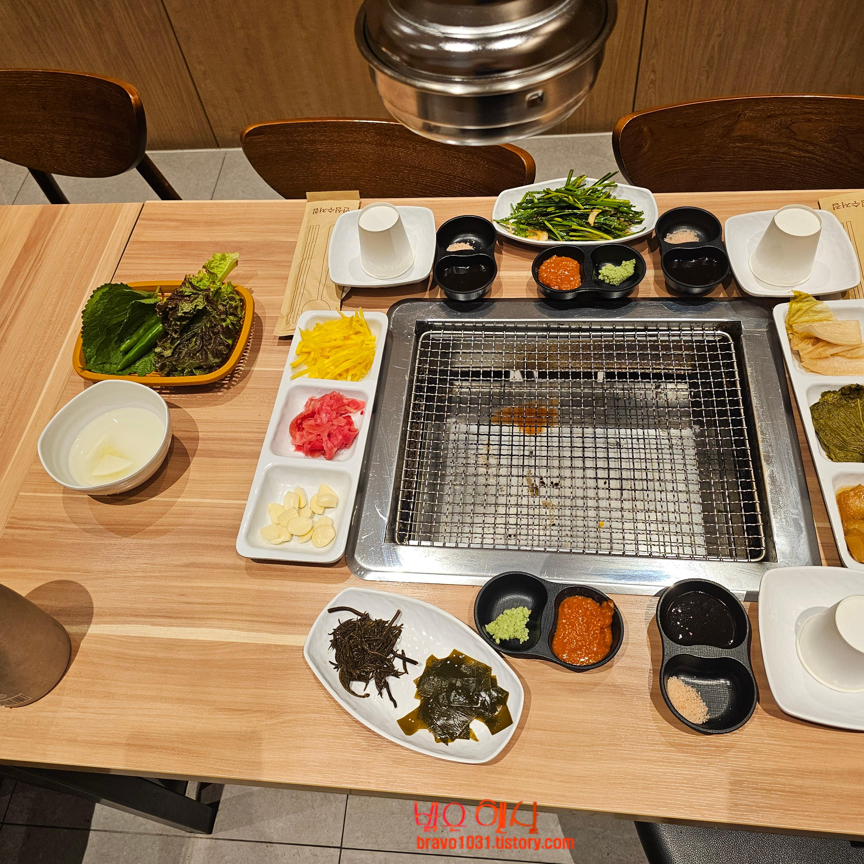 그리고 부추 겉절이와 쌈채소가 뒤에 따로 들어왔는데 부추겉절이부터 모든 기본찬을 셀프바에서 가져다 먹을 수 있었다.
