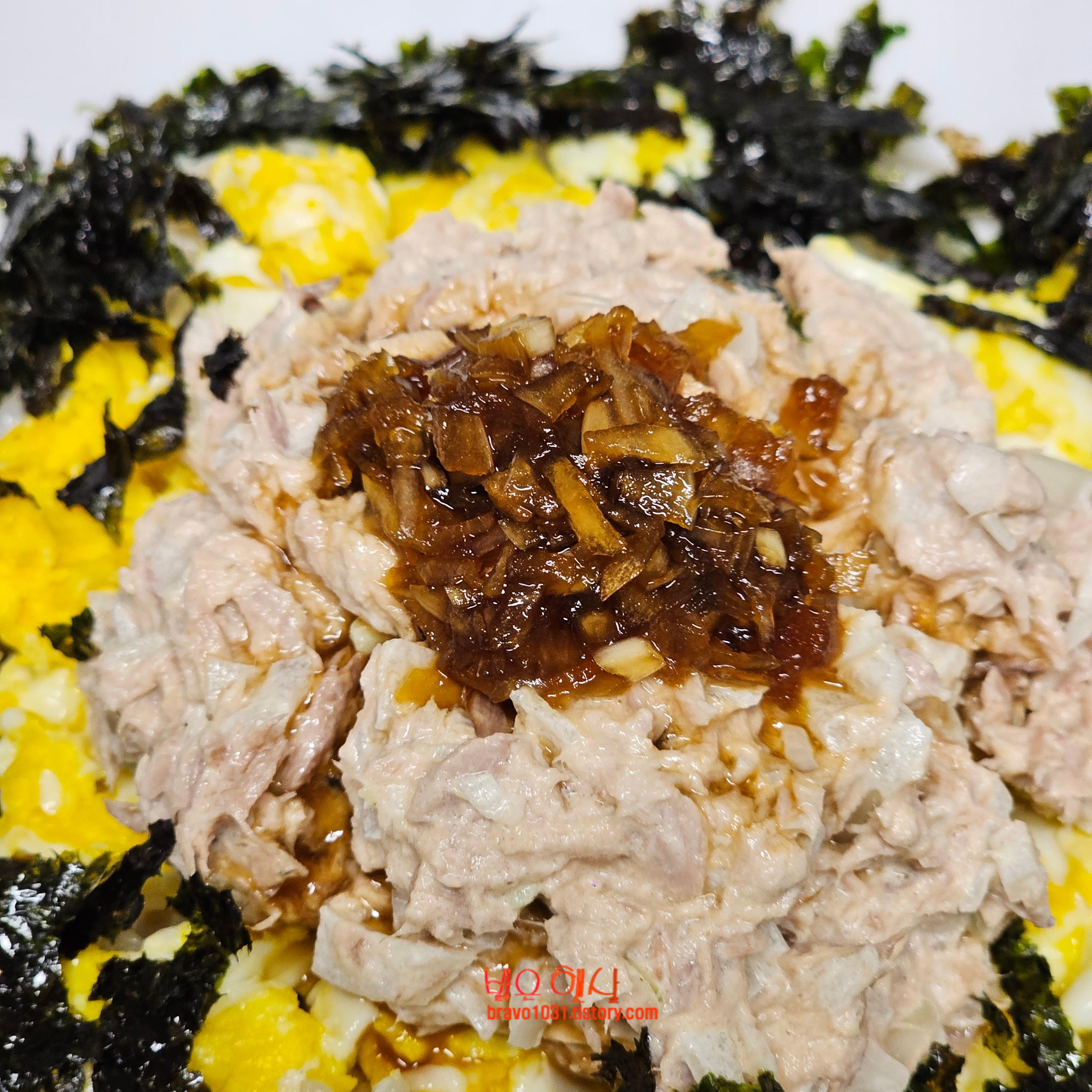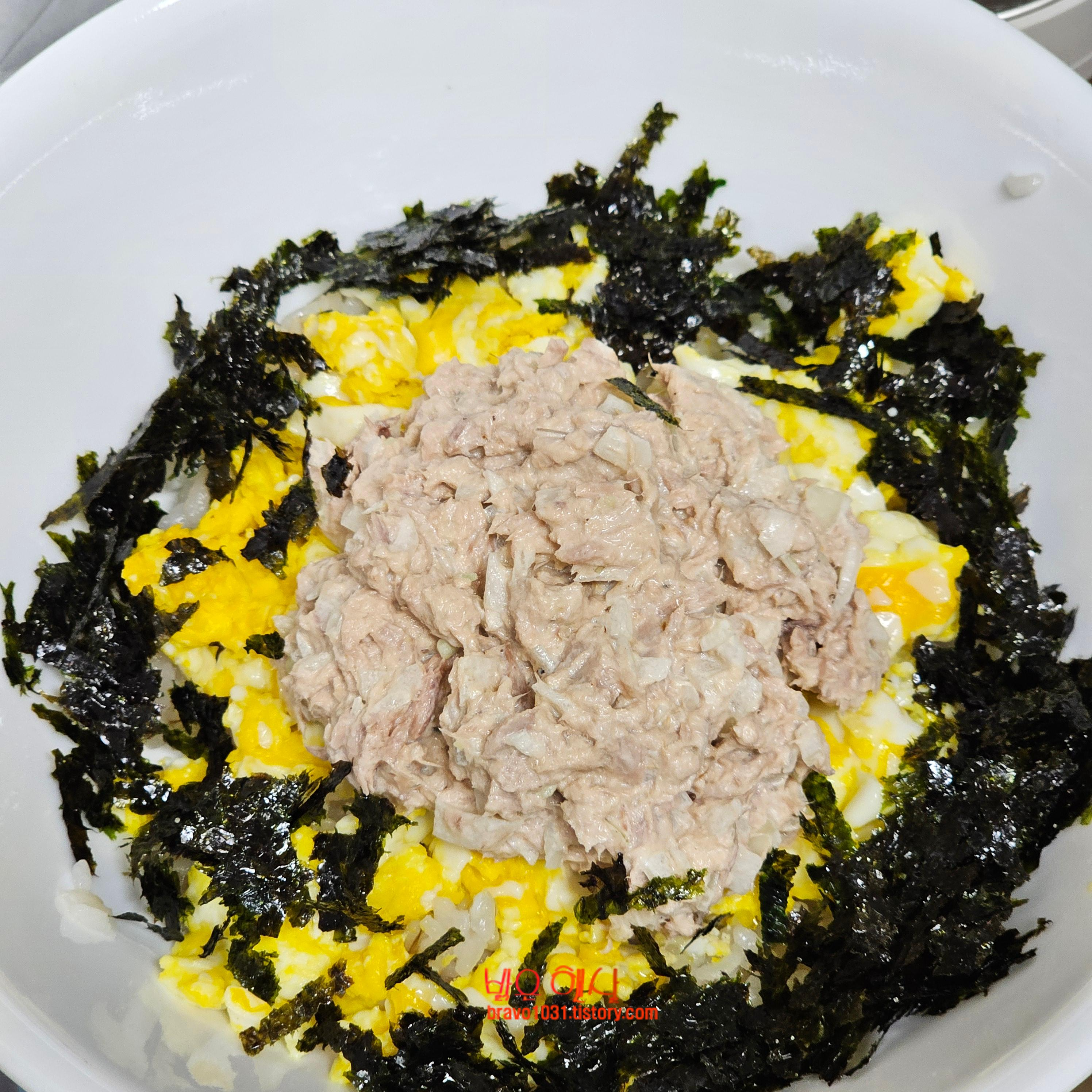그 안에 참치 마요 무침을 넣어 주고 스크램블 에그 주변으로 김가루를 둘렀다.