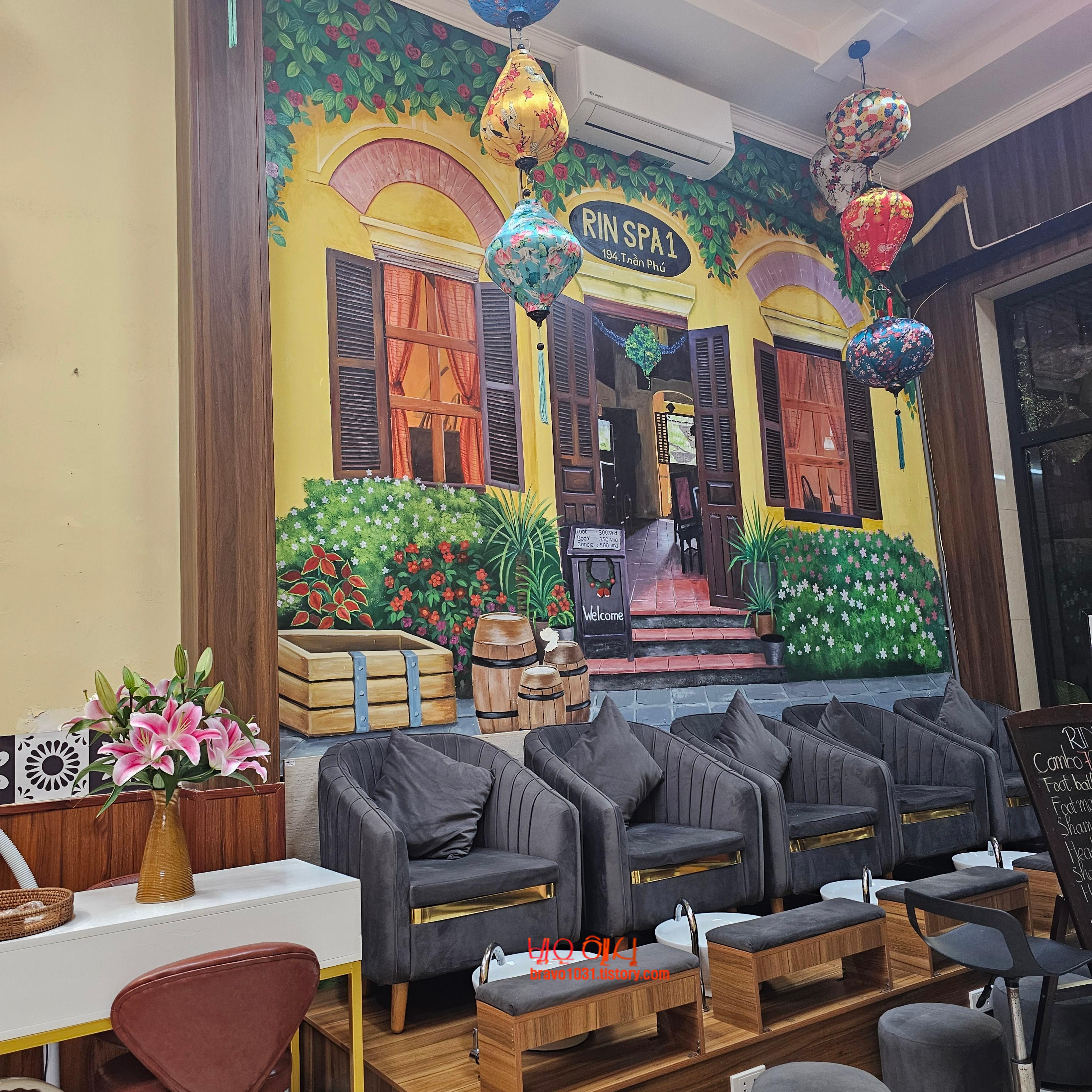 베트남 특유의 안으로 길쭉한 구조의 건물인데 안 쪽으로는 발맛사지 의자가 놓여 있었다.