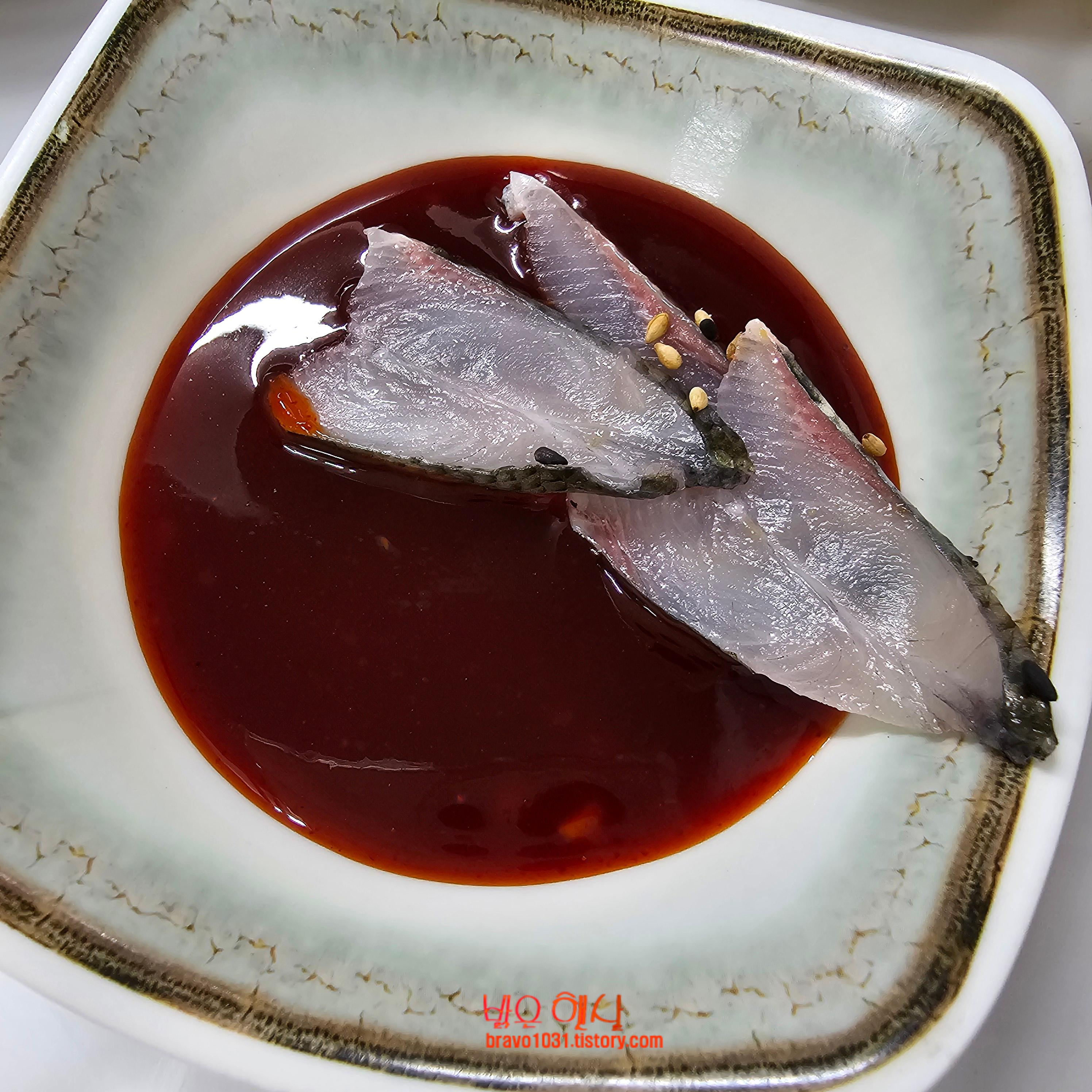전어회를 먹는 방법은 개인별로 다르지만 내가 선호하는 방식은 초장에 찍어 먹는 것을 좋아한다.