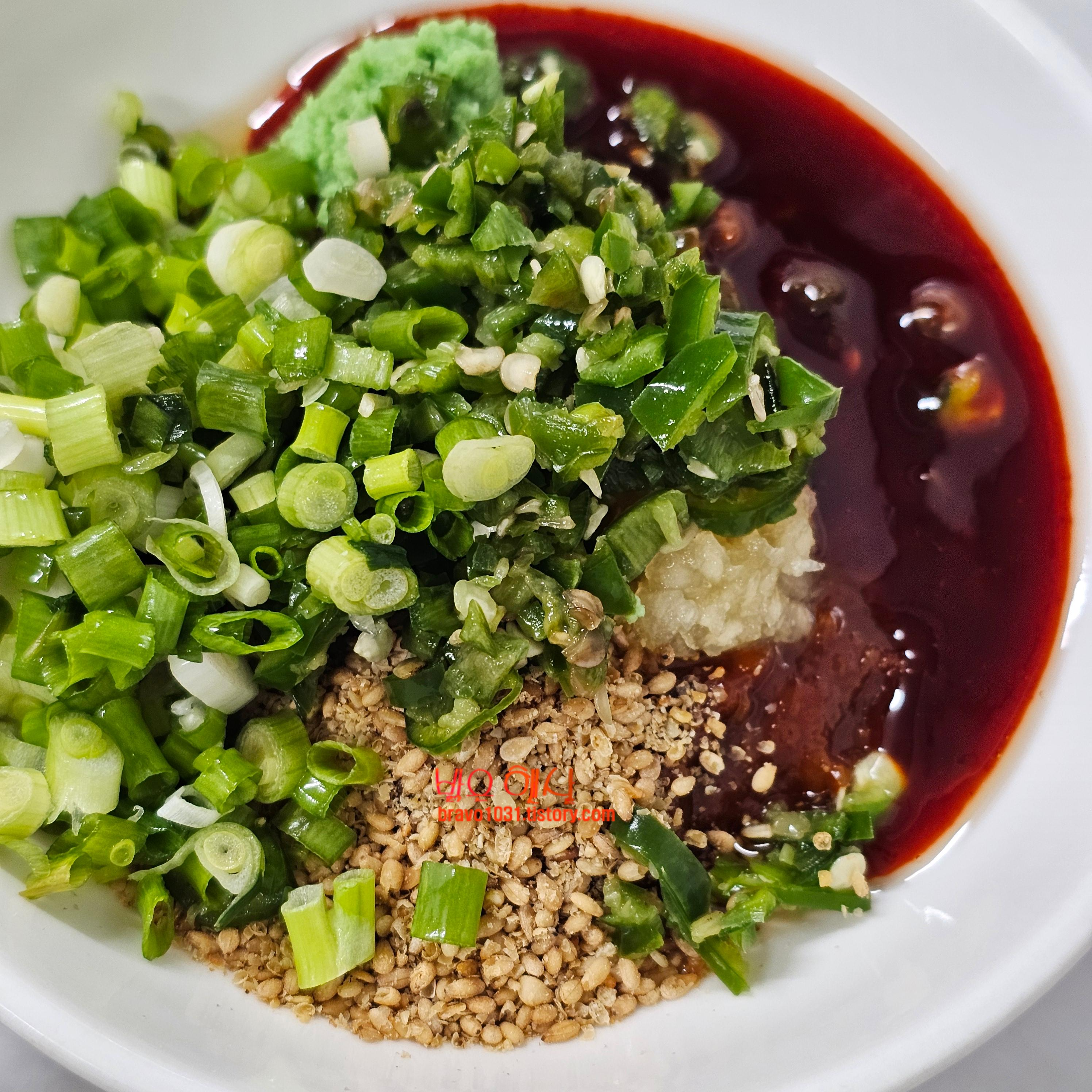 아주머니가 쌈장, 참기름, 간마늘, 깨를 한 접시 안에 다 세팅해서 주시는데 그 곳에 난 와사비, 다진고추, 다진쪽파, 초고추장 조금 넣고 비벼 준다.
