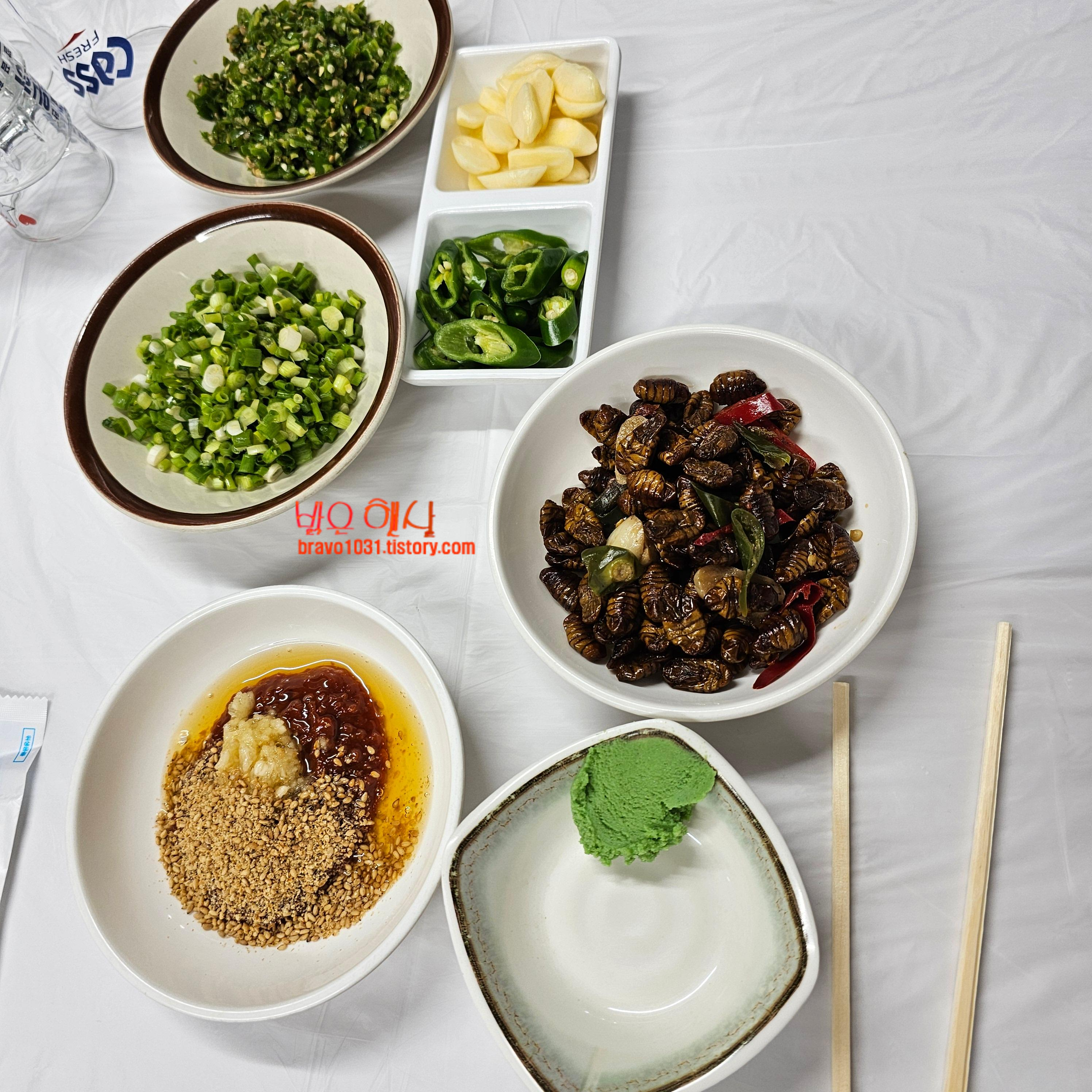 오이스틱, 방울토마토, 번데기, 삶은고구마, 삶은계란이었고 다진쪽파, 다진고추, 편마늘, 고추, 와사비 그리고 쌈장에 참기름, 간마늘, 갈은깨가 잔뜩 올라간 접시가 있었다.