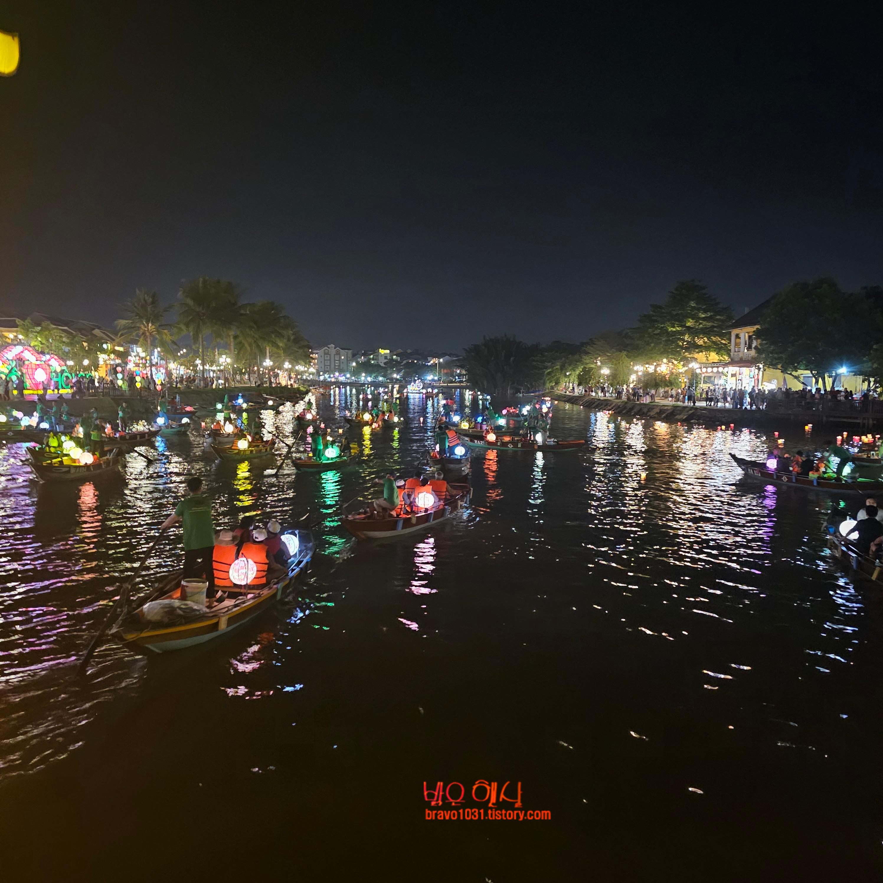 강에 빈 곳이 보이지 않을 정도로 빼곡하게 들어찬 배들과 그 위를 밝히는 등의 모습 그리고 강물을 따라 흘러가는 소원등의 모습이 너무도 화려해 보인다.