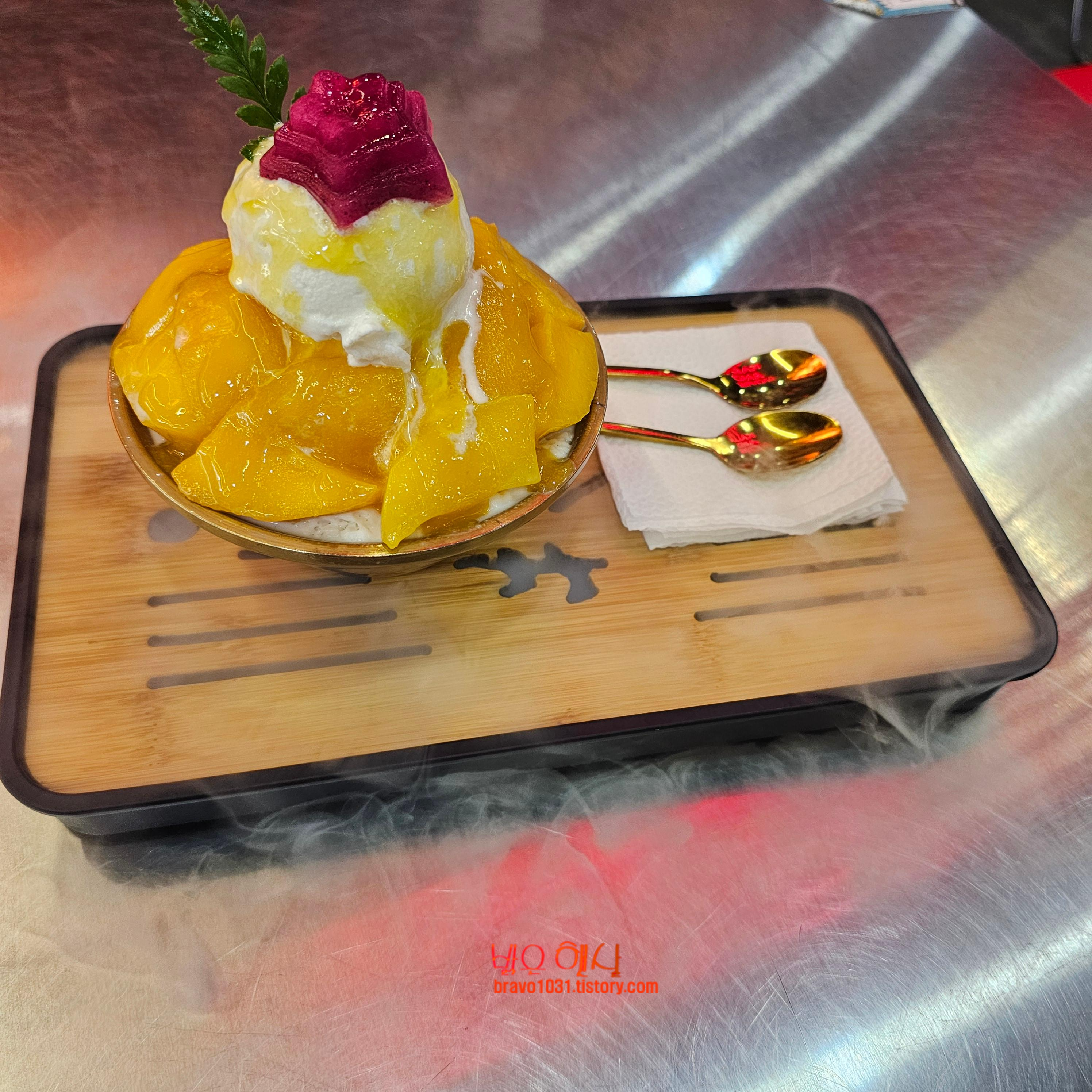 뭐니뭐니 해도 망고 빙수를 받을 때 가장 놀라운 것은 빙수 그릇을 담은 쟁반에서 연기가 폴폴 난다는 점이었다.