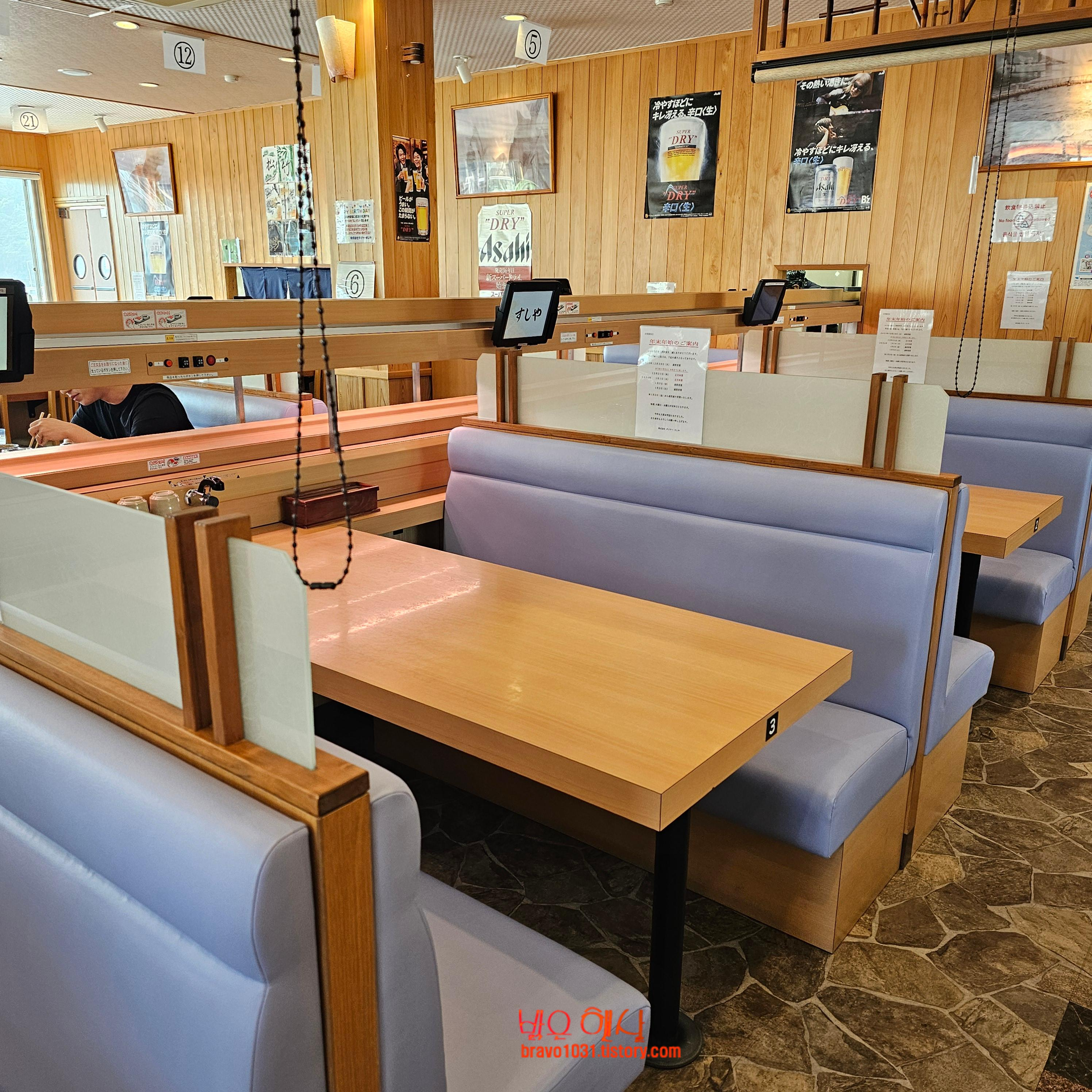 아주 예전에는 레일 위를 타고 있는 단품 초밥들도 있었는데 이제는 레일 위를 다니는 초밥은 없었고 각 테이블 마다 비치되어 있는 테블릿으로 주문을 하면 레일을 타고 초밥이 배달되어 오는 형식이었다.