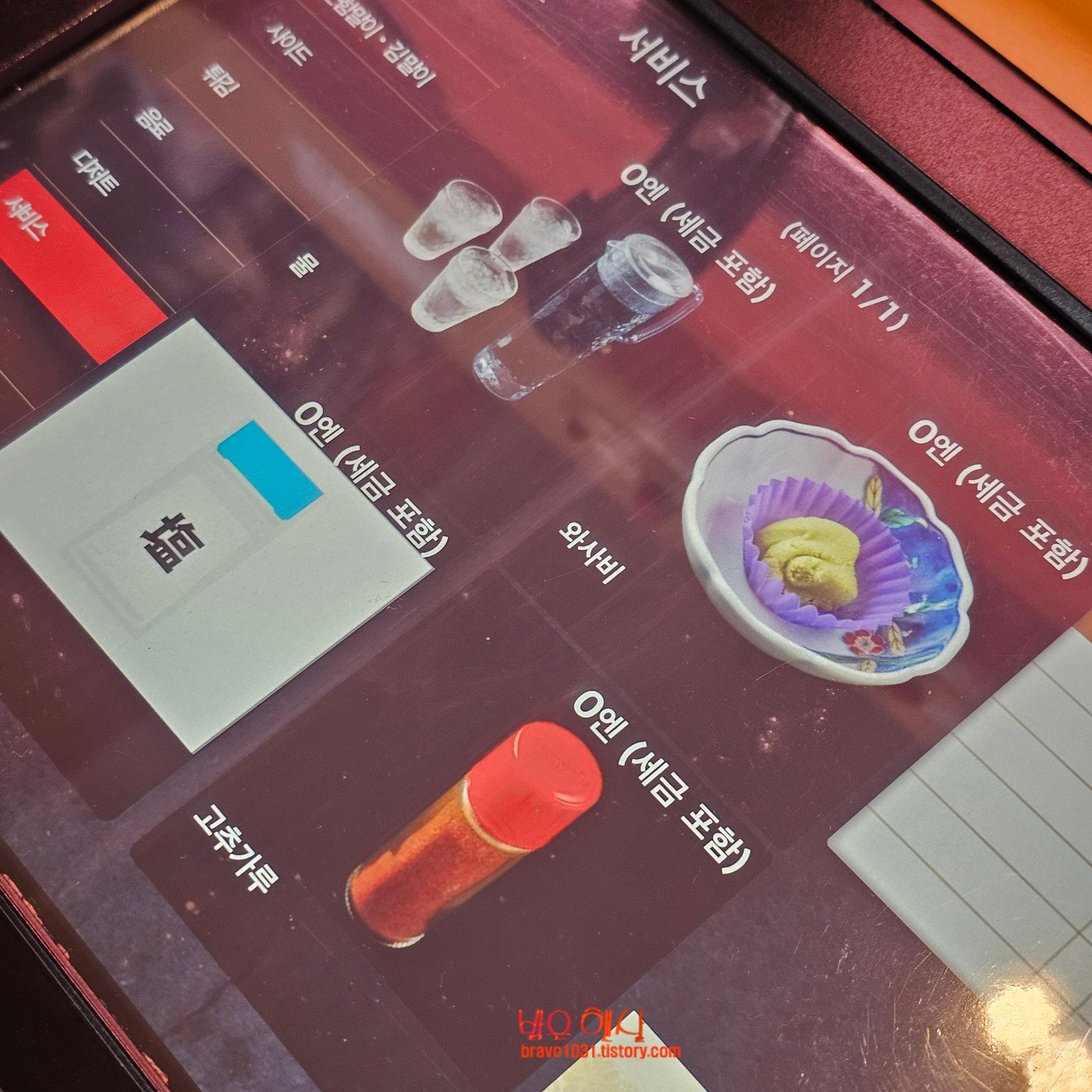 참고로 이 곳의 스시에는 와사비가 전혀 들어가 있지 않기 때문에 테블릿의 서비스 항목에 들어가서 와사비를 주문해야 한다.
