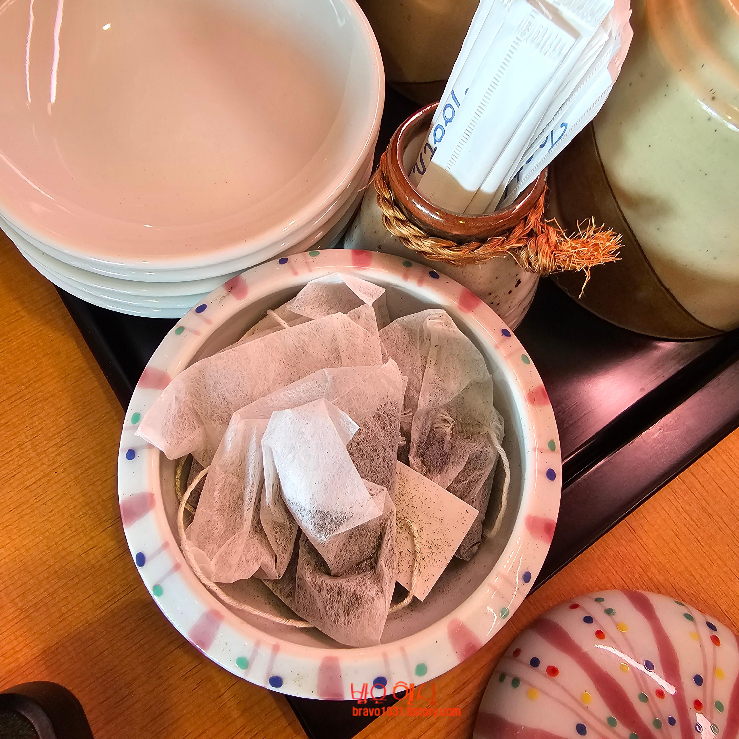 테이블에는 여전히 작은 종지, 녹차 티벡, 간장, 초생강등이 있었다.