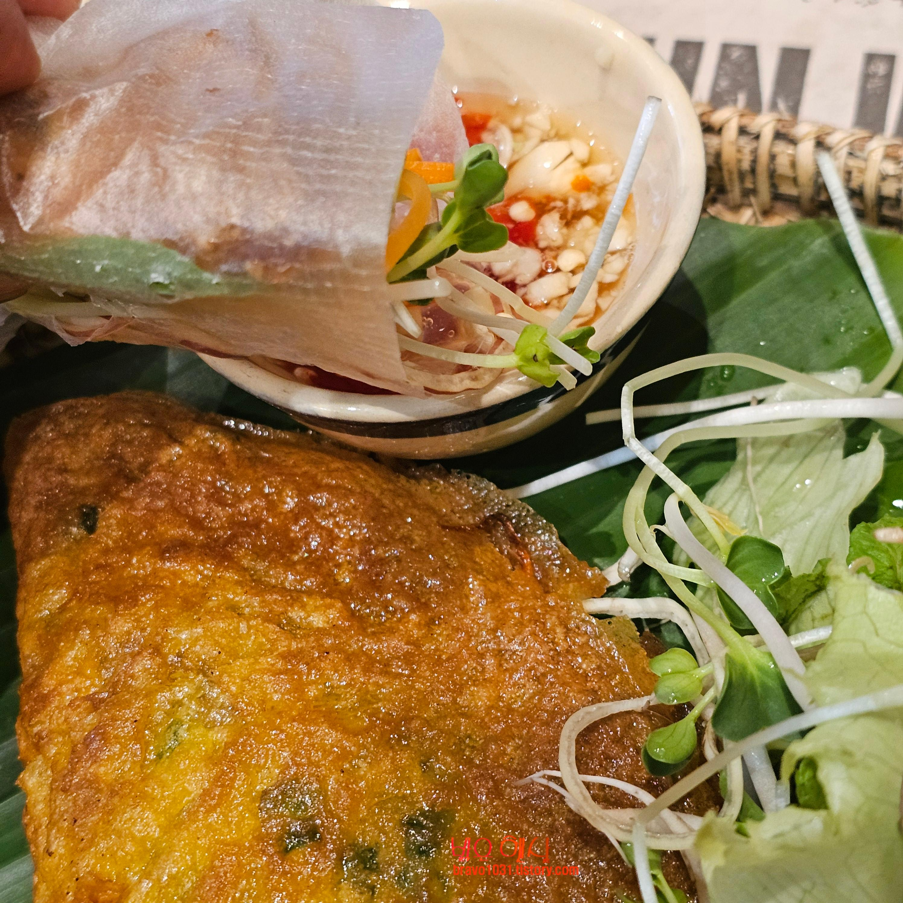 반쎄우는 라이스페이퍼 위에 반쎄우와 야채들을 골고루 올려서 쌈으로 잘 싼 다음에 소스에 찍어서 먹으면 된다.