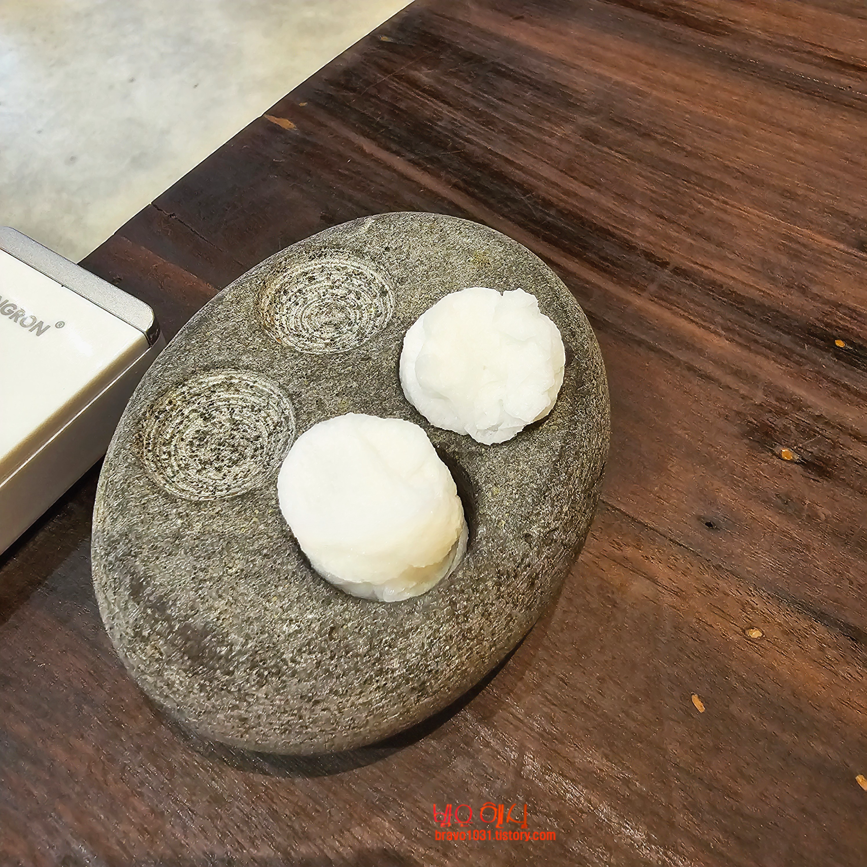 음식을 주문하면 물티슈를 가져다 주는데 작은 돌 위에 올려진 코인티슈가 귀여웠다.