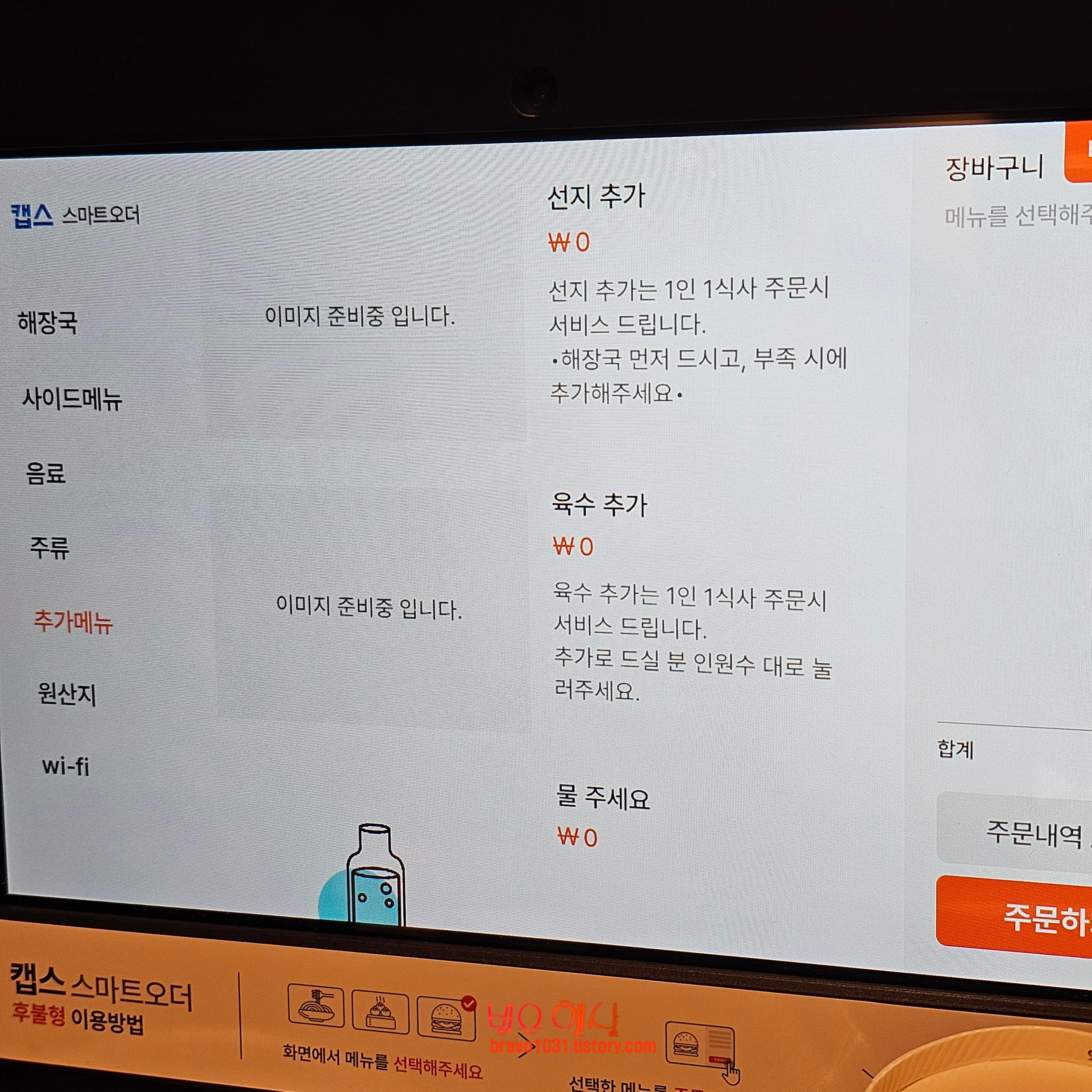 해장국을 다 먹고 난 다음 선지를 추가 했을 때 위의 오른쪽 사진처럼 선지가 추가되었다.