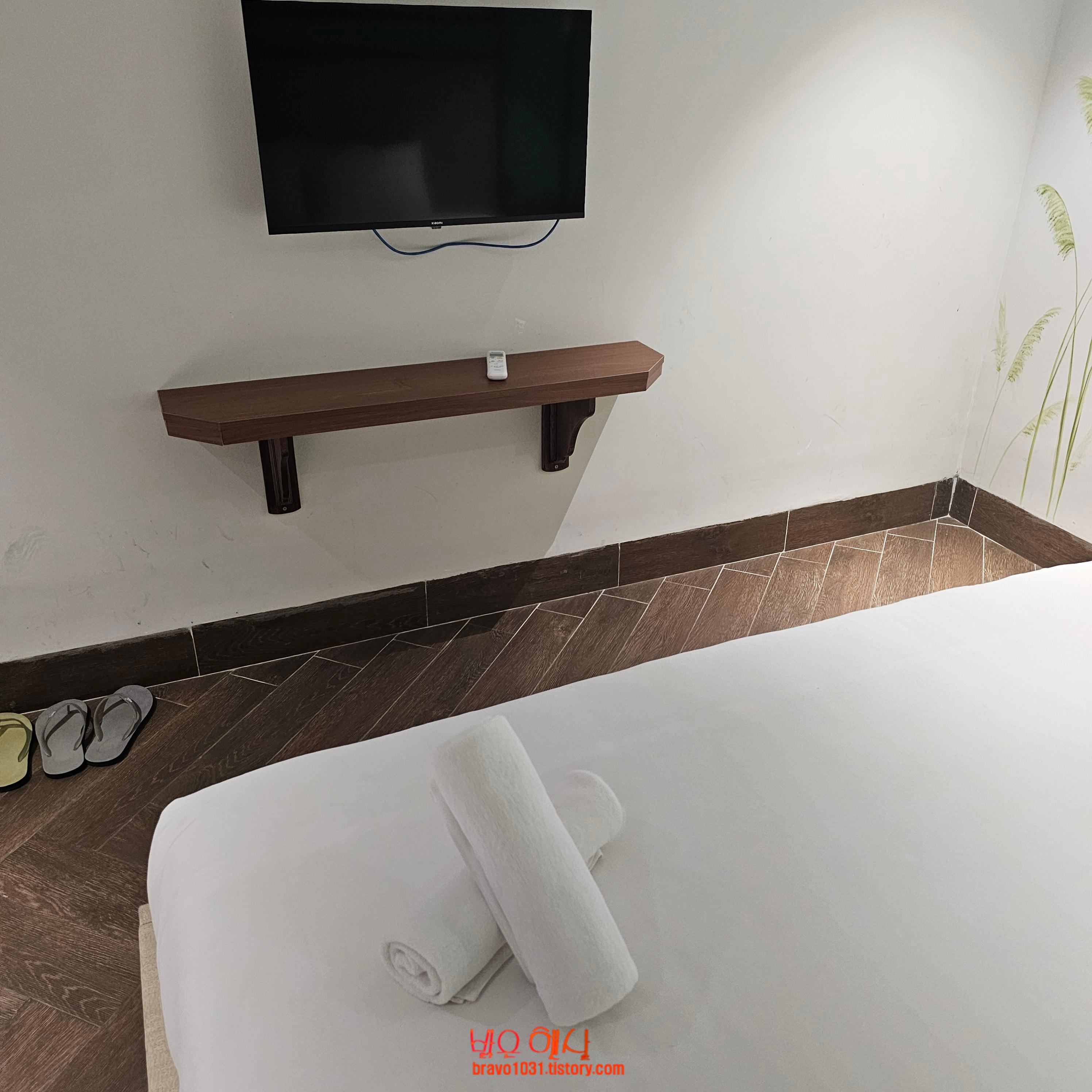 텔레비젼은 침대 발치쪽 벽에 붙어 있었고 기본적인 어메니티도 있었다.