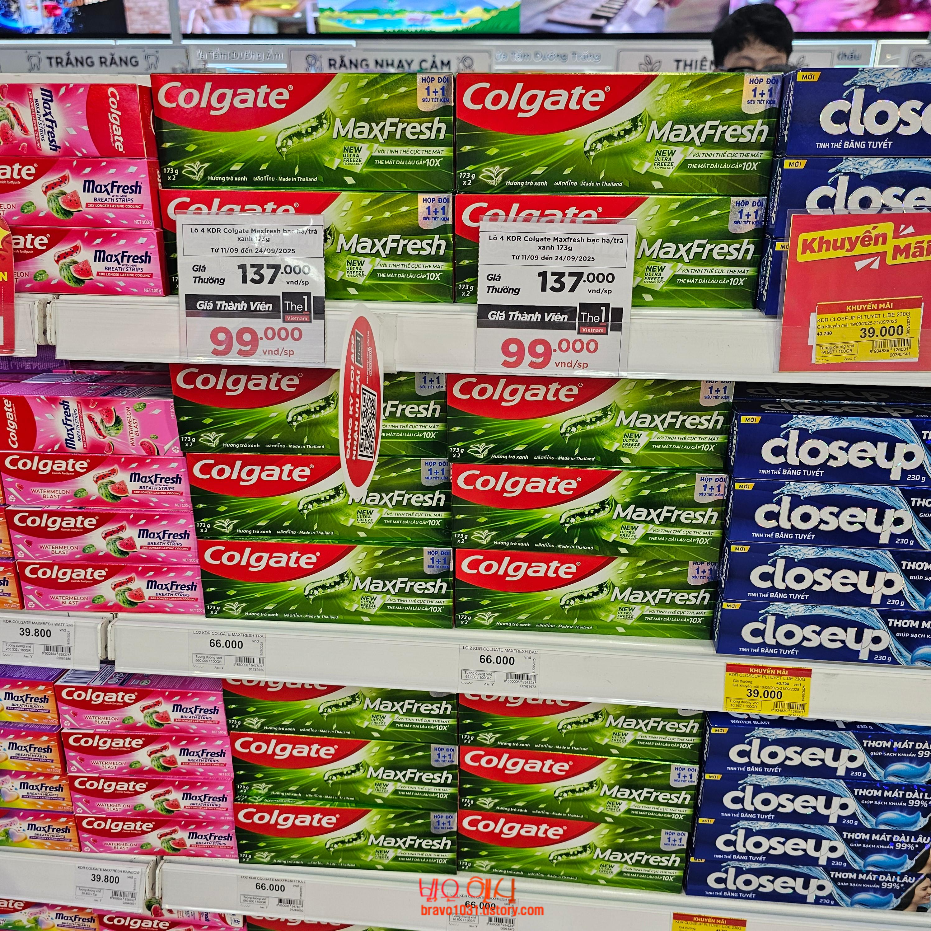 콜게이트 녹차향 두개 한 세트 짜리 치약이 고마트에서 137,000동인데 행사로 99,000동이었다.