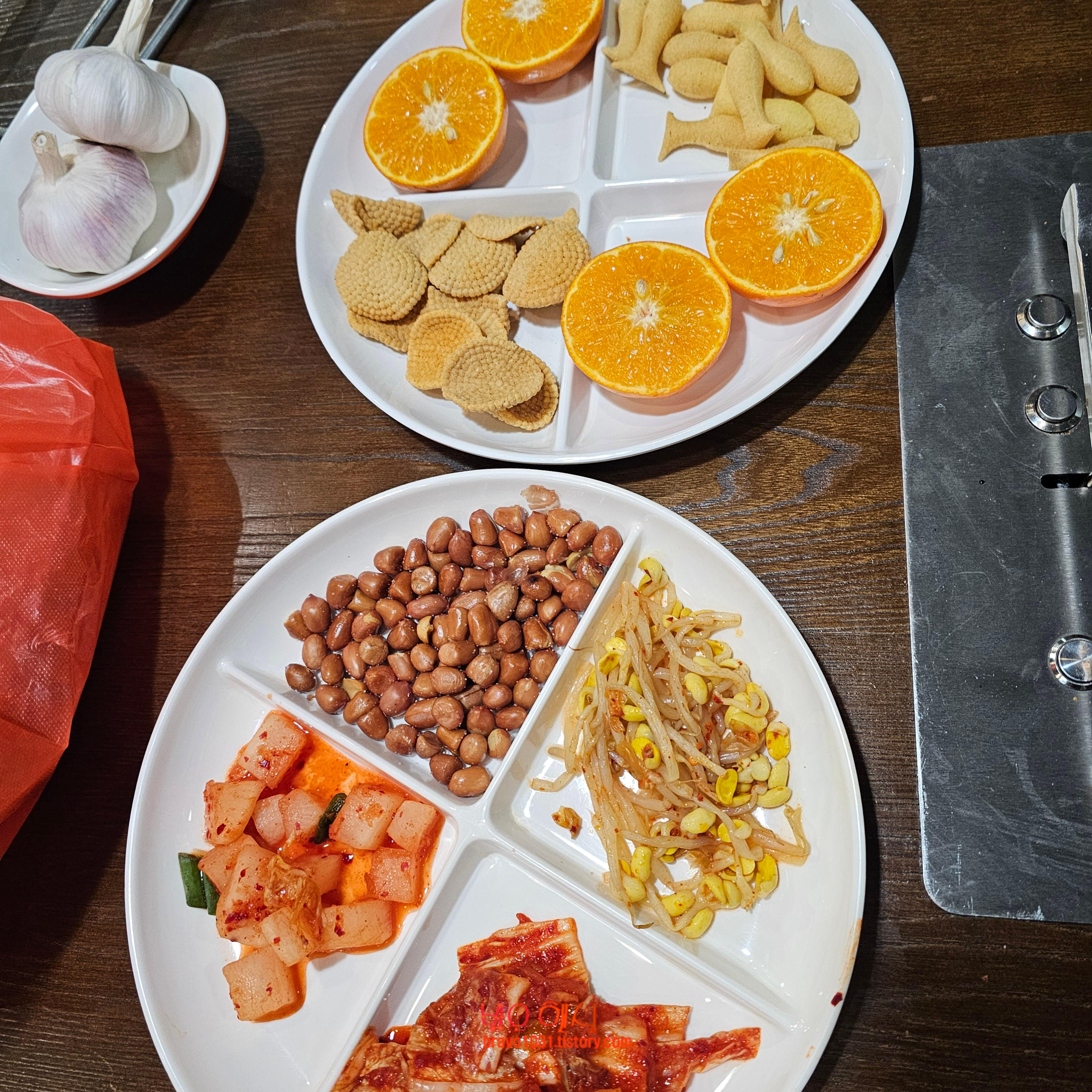 그리고 귤, 과자, 밑반찬 종류등이 세팅이 되어 있는데 기본 세팅된 음식들은 셀프 바에서 추가로 더 가지고 와서 먹을 수 있다.