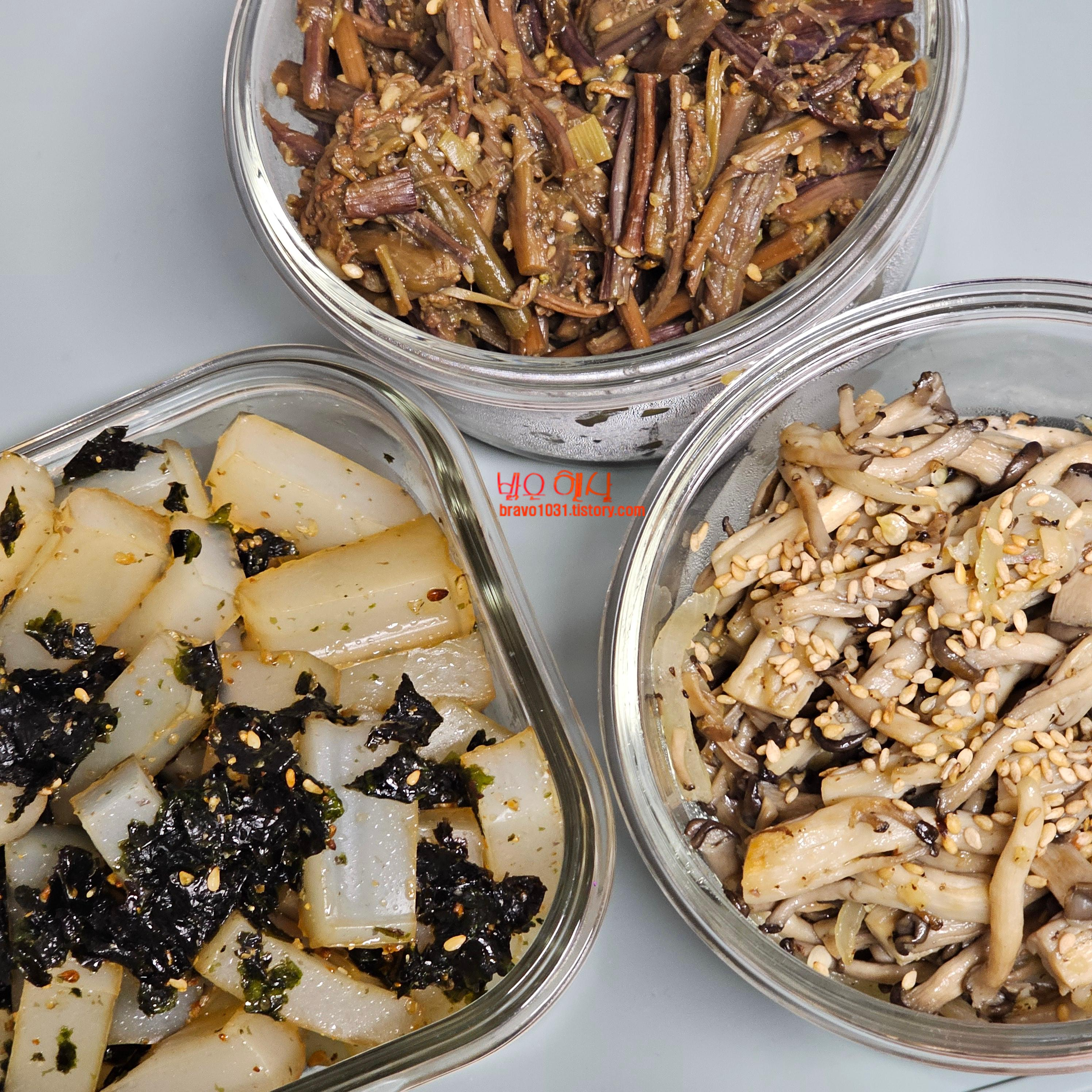 냉동실에 있던 데친 고사리도 볶고 느타리버섯도 볶고 청포묵도 무치고.