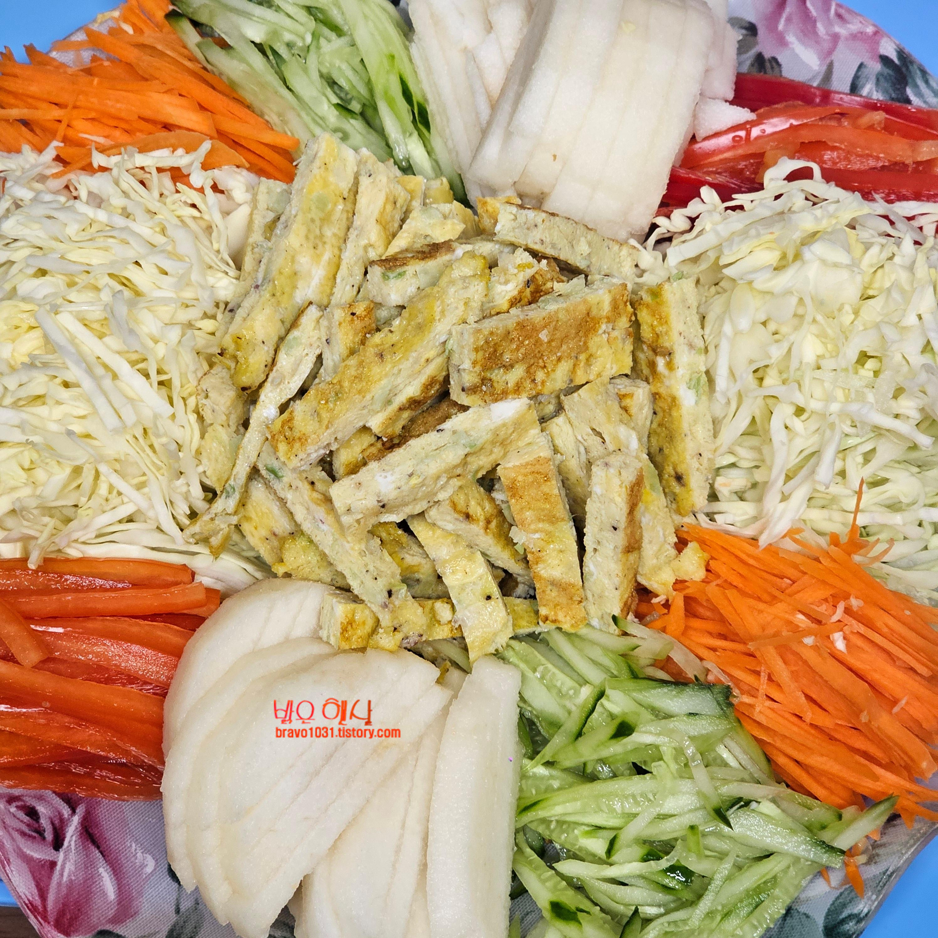 집 냉장고를 뒤져서 양배추도 채 썰고 봄동도 채 썰고 당근도 썰고 명란도 다져 넣고.