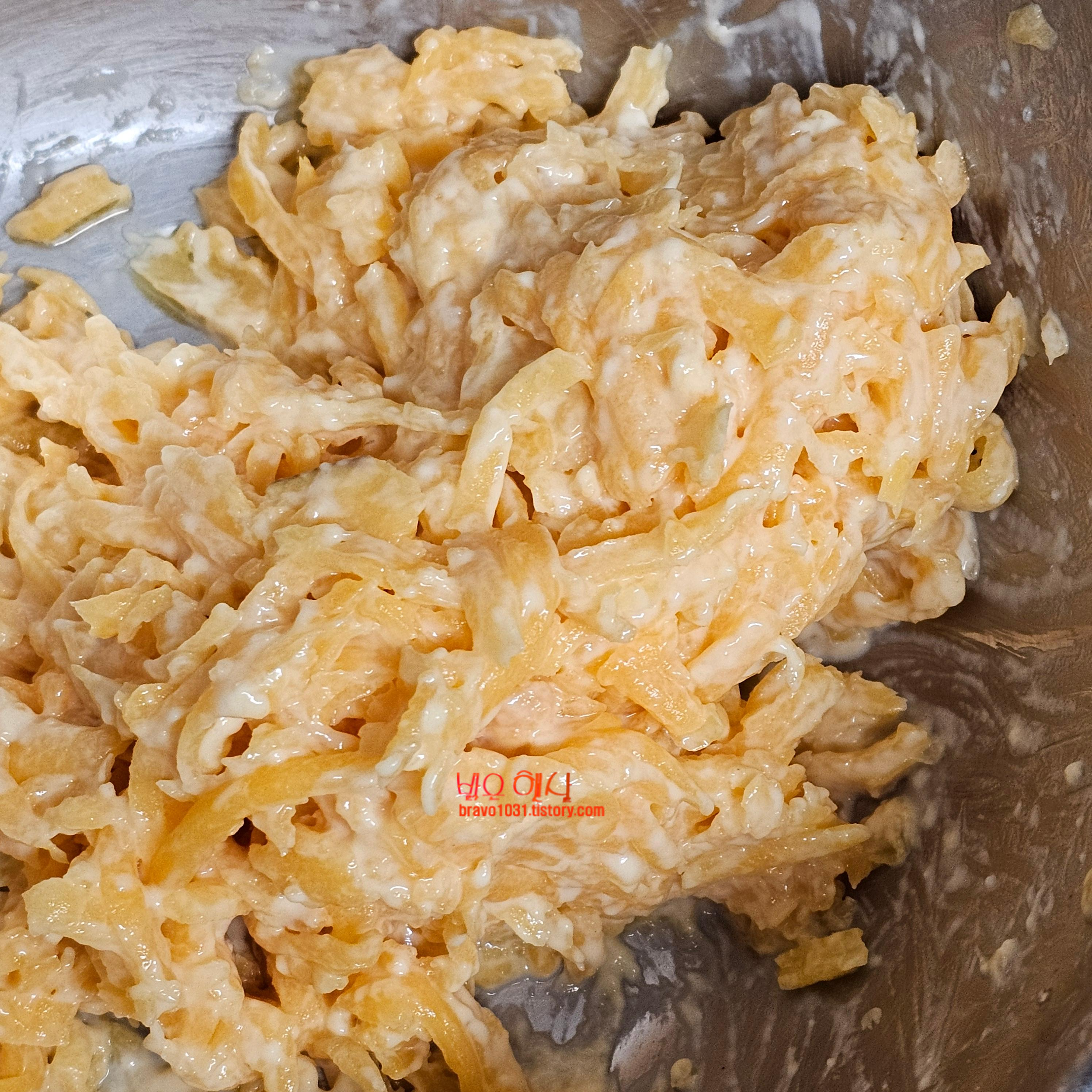 물은 하나도 넣지 않고 호박 자체의 물만으로 반죽을 만드는데 이때 설탕을 살짝 가미해 줘야 한다.